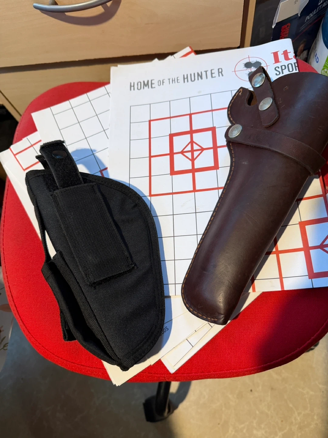 Leather holster $50 ($217) new. Nylon holster $15. 7 large targets $5. sheepskin lined rifle case $50. Best ear protectors $50 with pouch $10. Hard foam egg shell carrying case $15. All together worth $292.