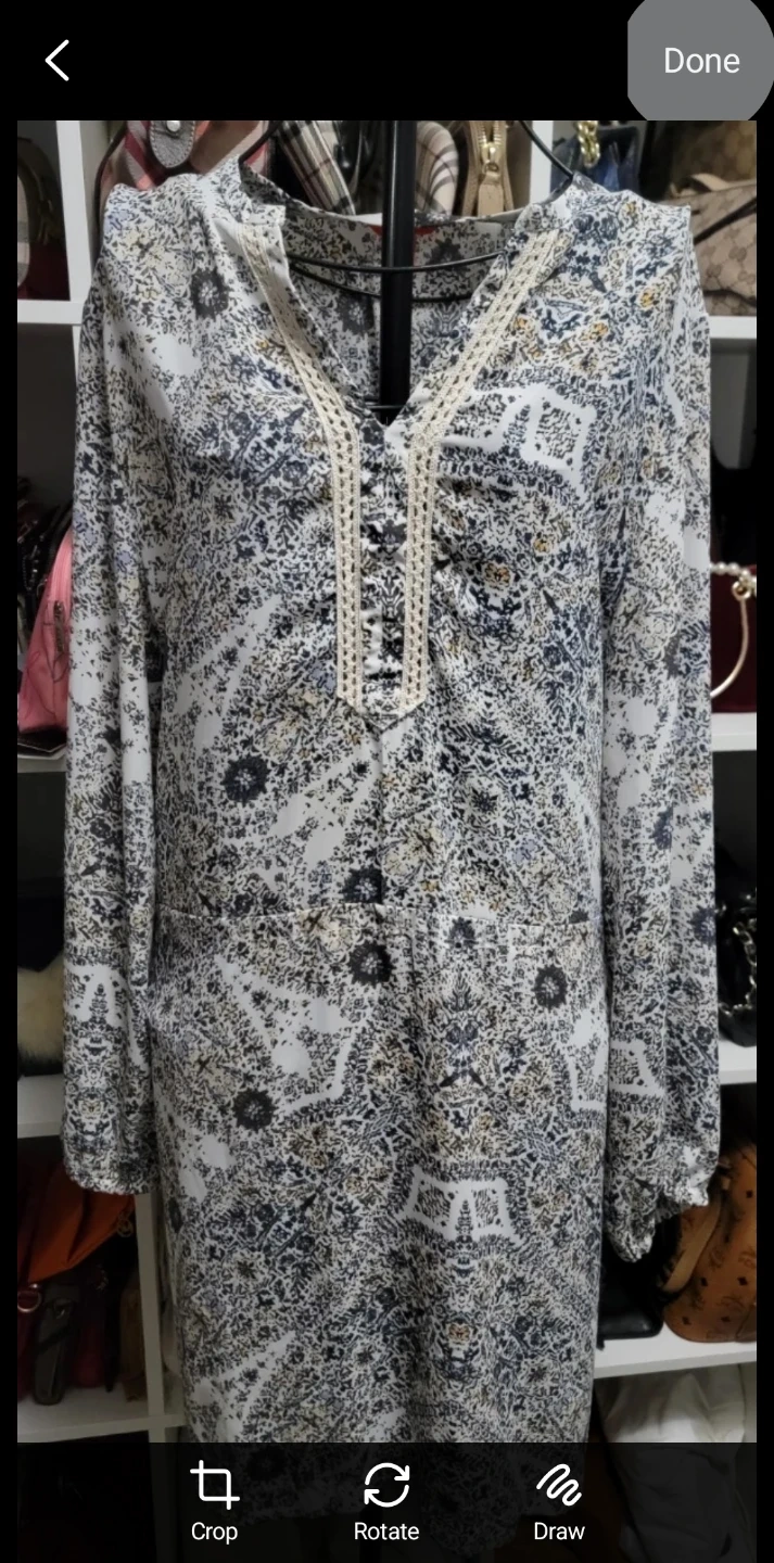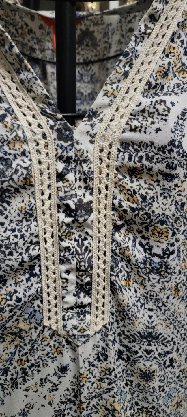 This lovely blouse features a white base with a black, blue, and yellow floral pattern. It has long sleeves and a decorative crochet trim along the neckline. It's lightweight and perfect for spring or fall.