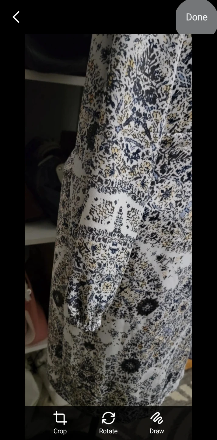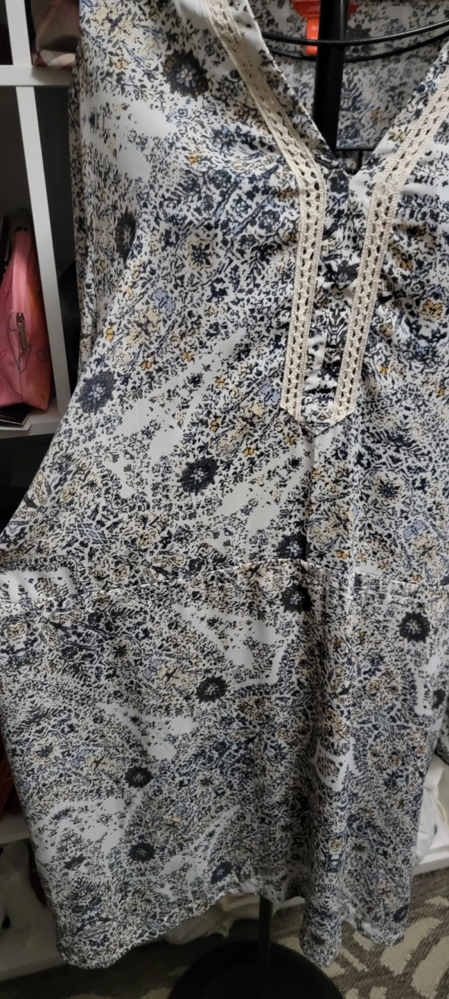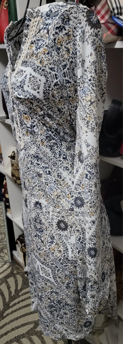 This lovely blouse features a white base with a black, blue, and yellow floral pattern. It has long sleeves and a decorative crochet trim along the neckline. It's lightweight and perfect for spring or fall.