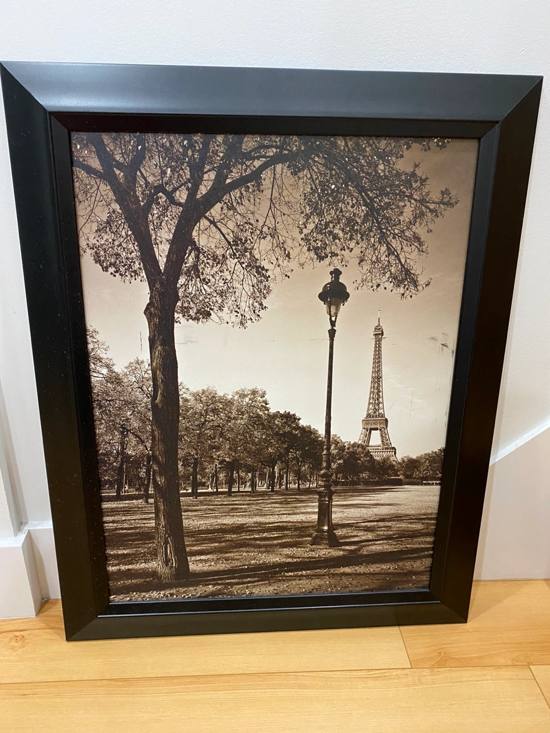 Framed sepia-toned print. Features the Eiffel Tower, trees, and a lamppost. Black frame. Perfect for Parisian-themed decor.