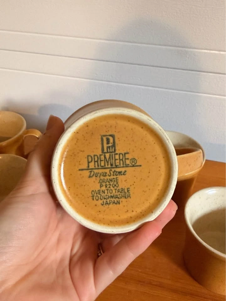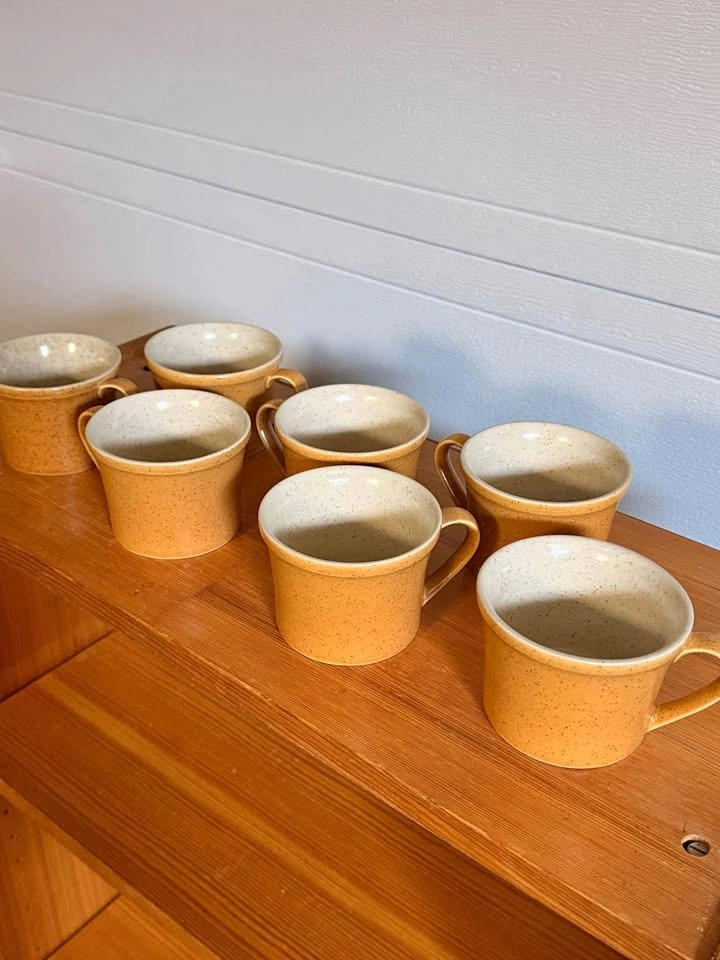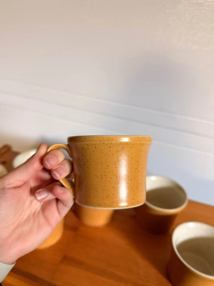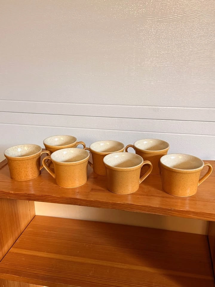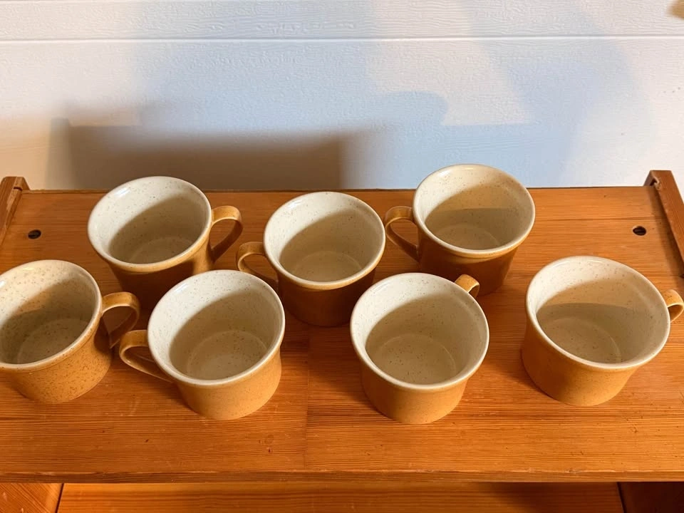 Durable Premiere Dura Stone cappuccino size cups. Set of 7. Mustard yellow speckled color with lighter speckled insides. Oven to table and dishwasher safe. Made in Japan.