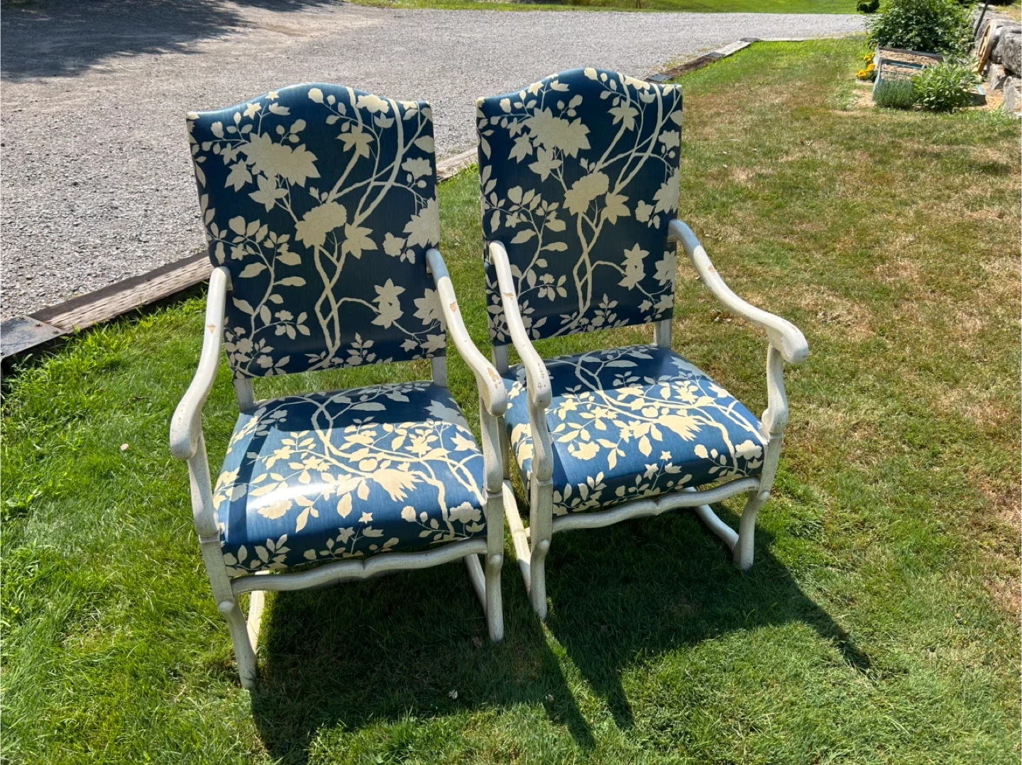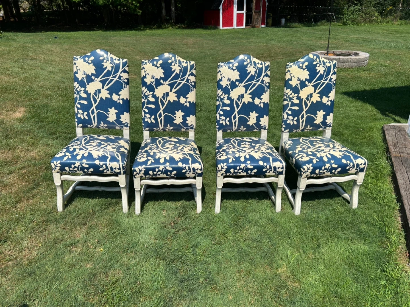 Six dining chairs with a blue vinyl . Features a scalloped trim on the apron and white wooden frames. These chairs are upholstered in vinyl