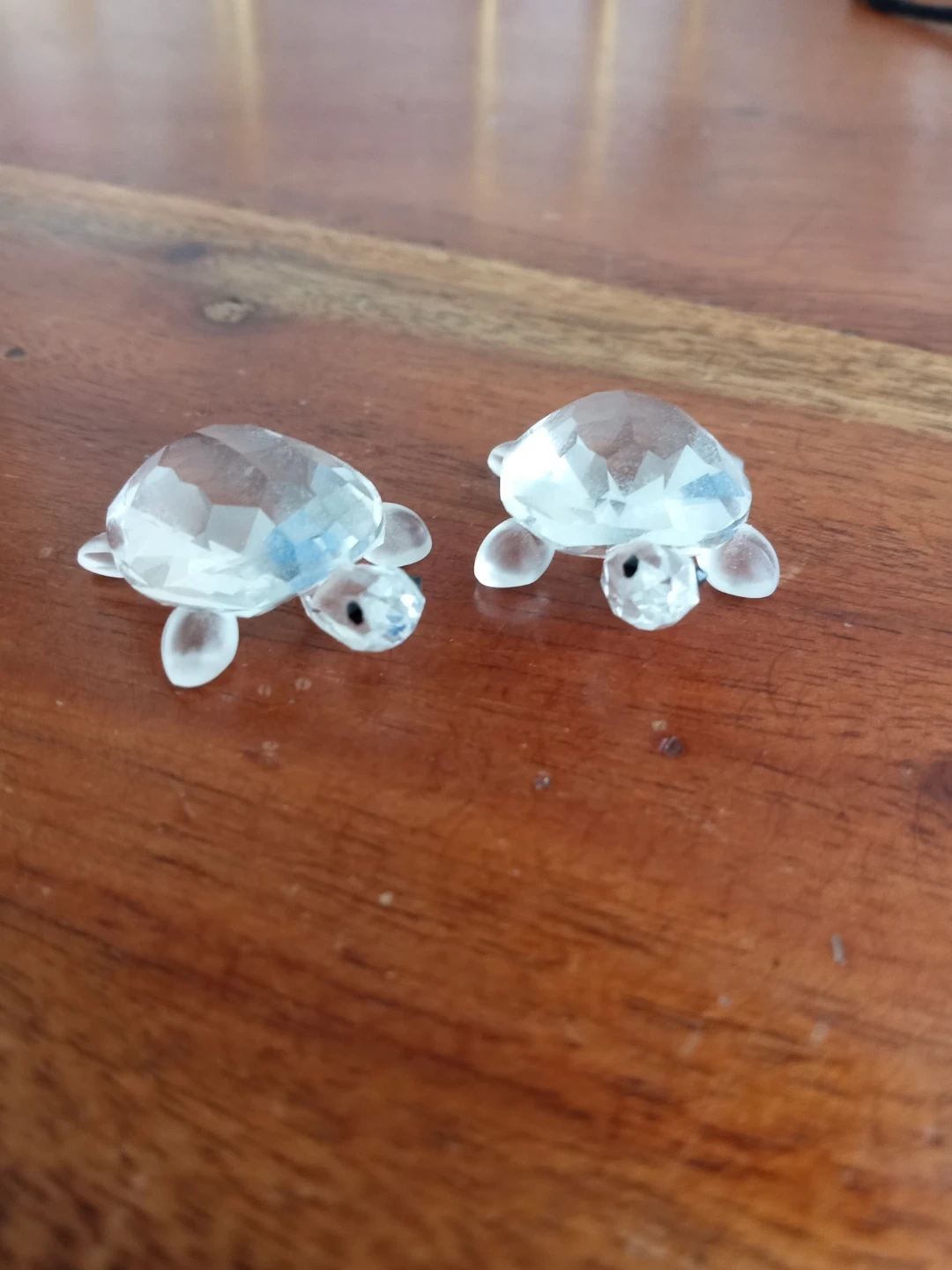 A pair of sparkling Swarovski crystal turtles figurines from the discontinued "Peaceful Countryside" collection. They have a faceted design that catches the light nicely.