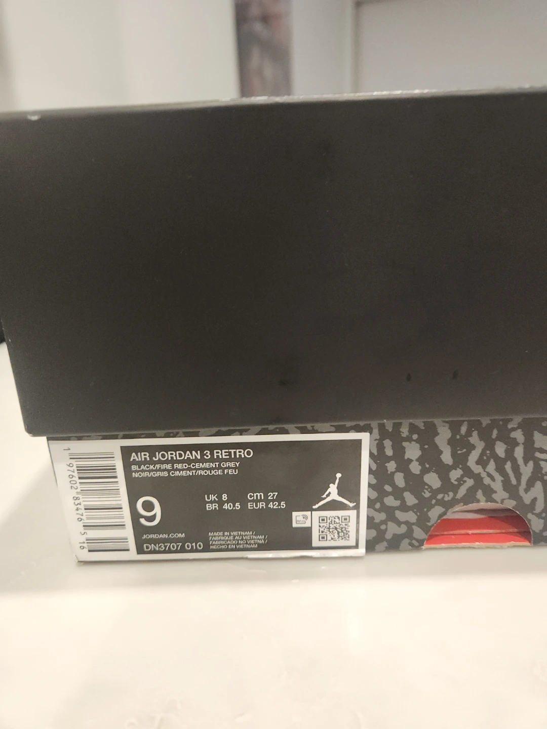 Men's Air Jordan 3 Retro sneakers in black, cement grey, and fire red. Size 9 (US Men's). These kicks are in great shape and ready for a new owner!