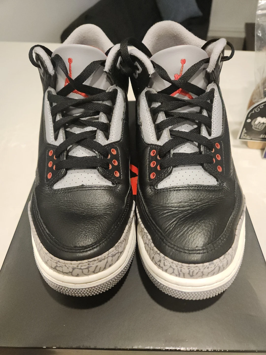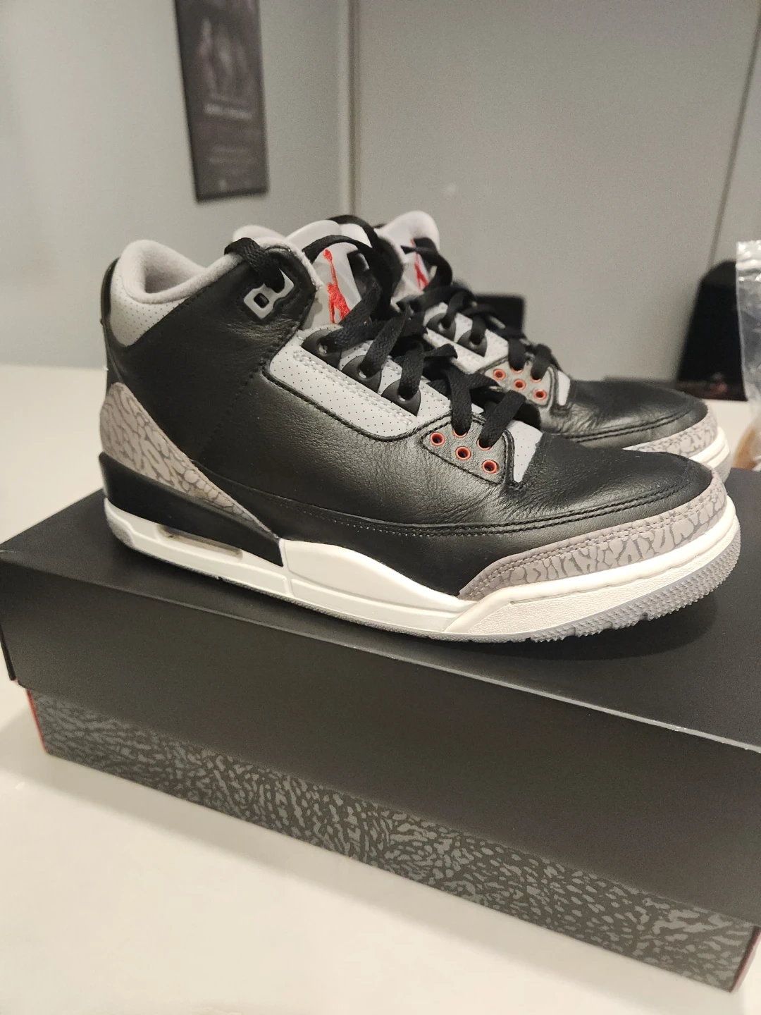 Men's Air Jordan 3 Retro sneakers in black, cement grey, and fire red. Size 9 (US Men's). These kicks are in great shape and ready for a new owner!