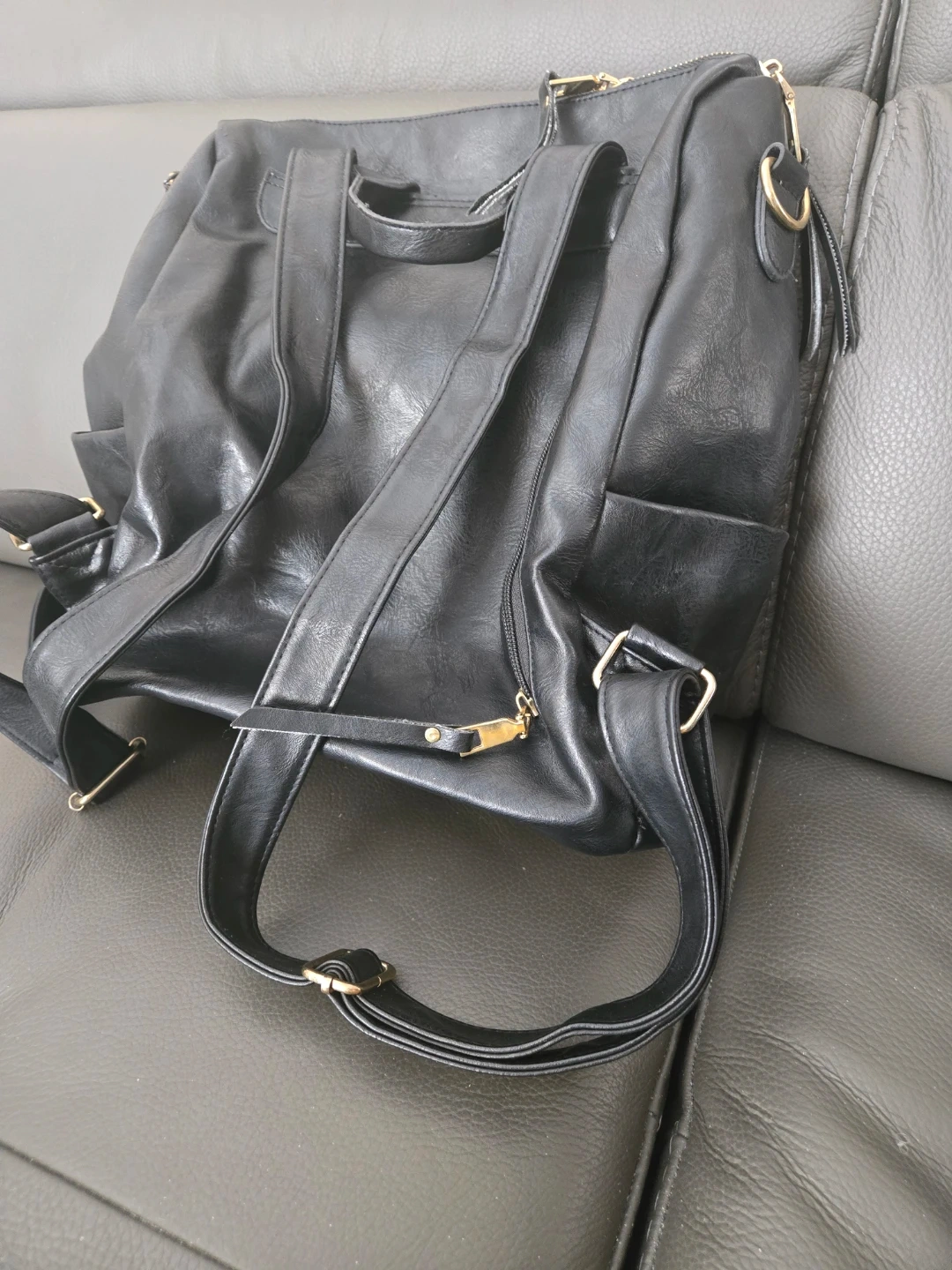 This black backpack is made from faux leather. It has multiple zippered pockets for storage. It's a versatile bag for everyday use.