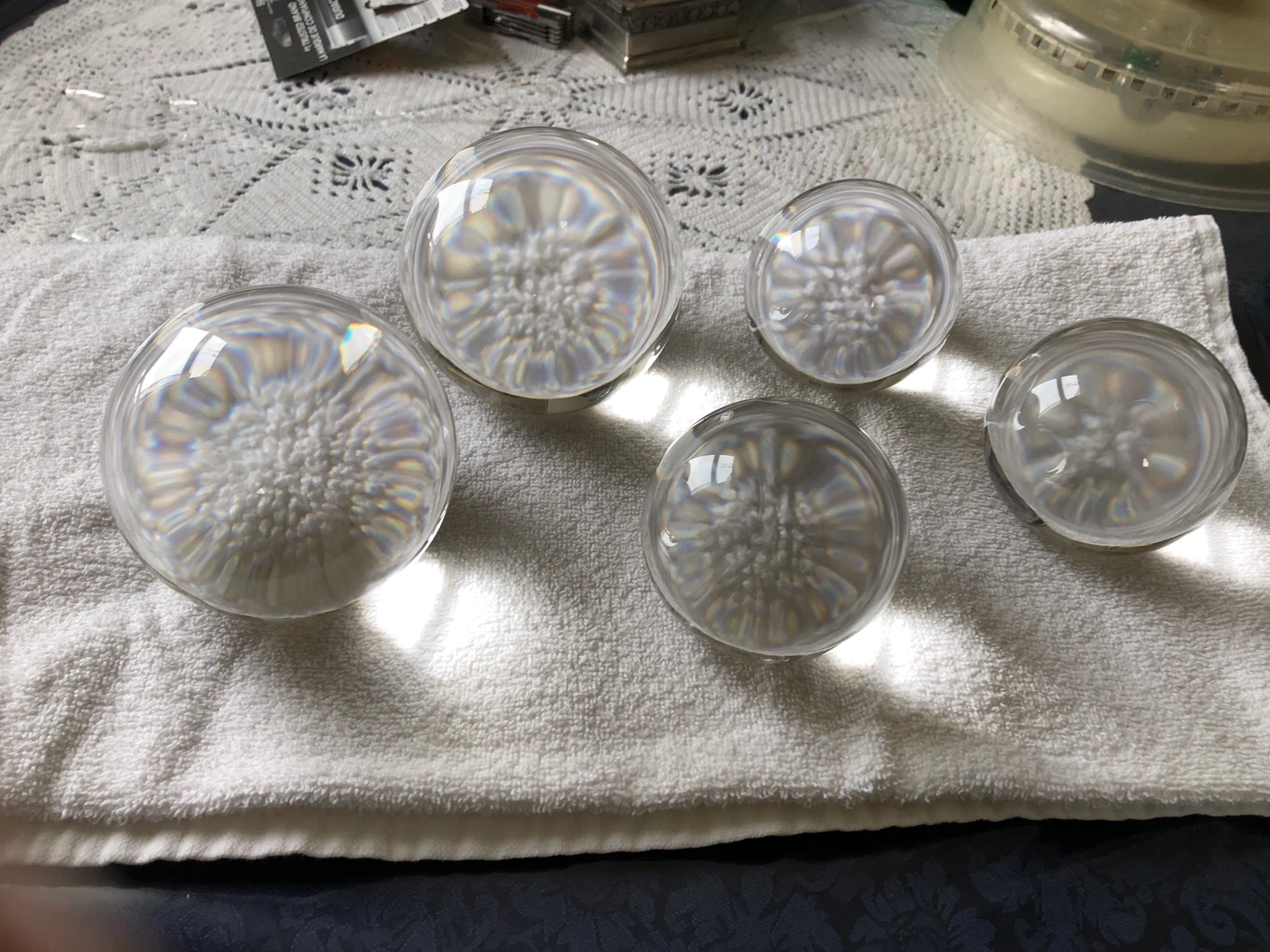This is a set of five clear glass spheres. These decorative orbs would make a nice accent piece for any room.