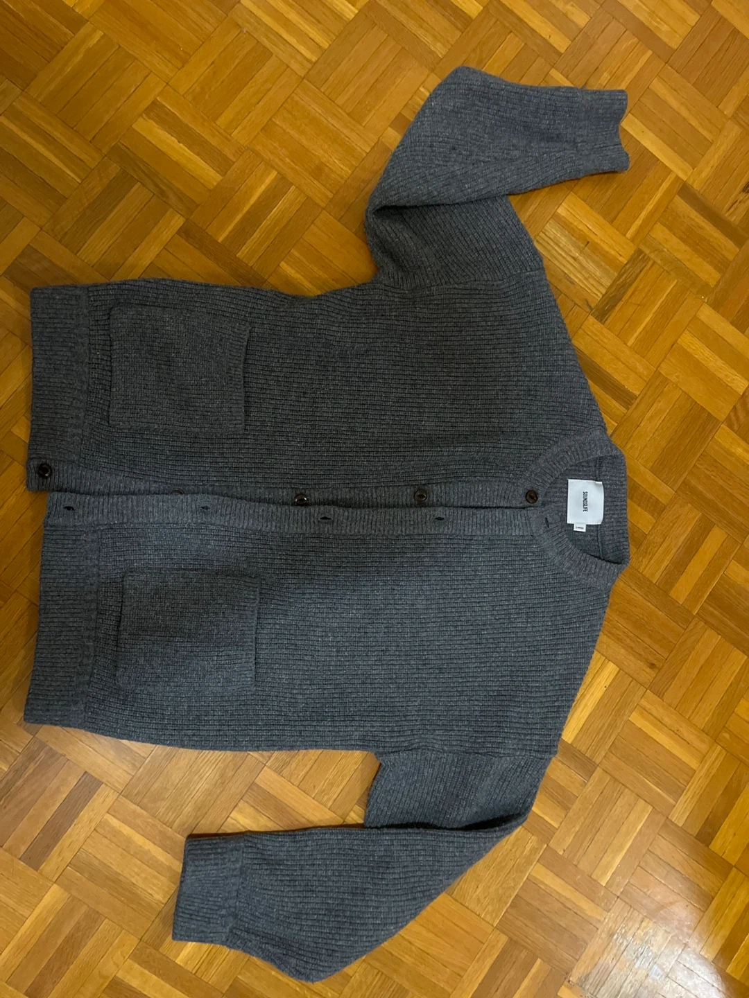 This is a Soundlife knit cardigan in charcoal grey. It features two front pockets and a button-up front. The material is a soft knit. This cardigan is great for layering during cooler weather.