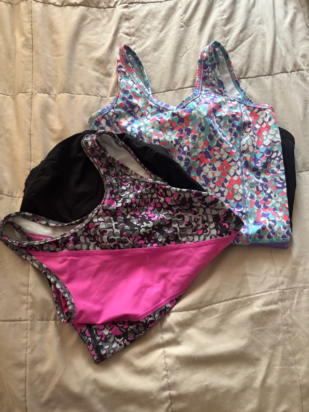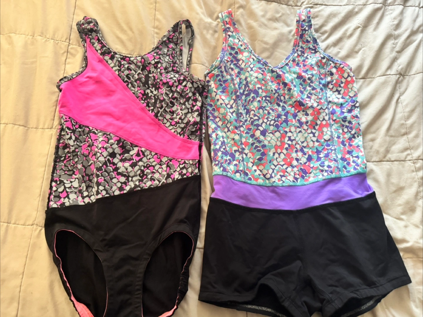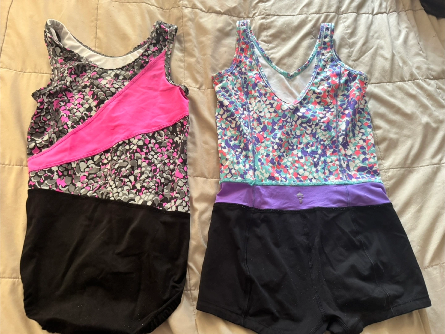 92Two gymnastics leotards in size small! One is a floral pattern with a pink accent and the other is a colourful pattern with a purple waist band. Both have black bottoms. Great for young gymnasts! Size 8 Ivvivva brand Ironwood Richmond pick up
