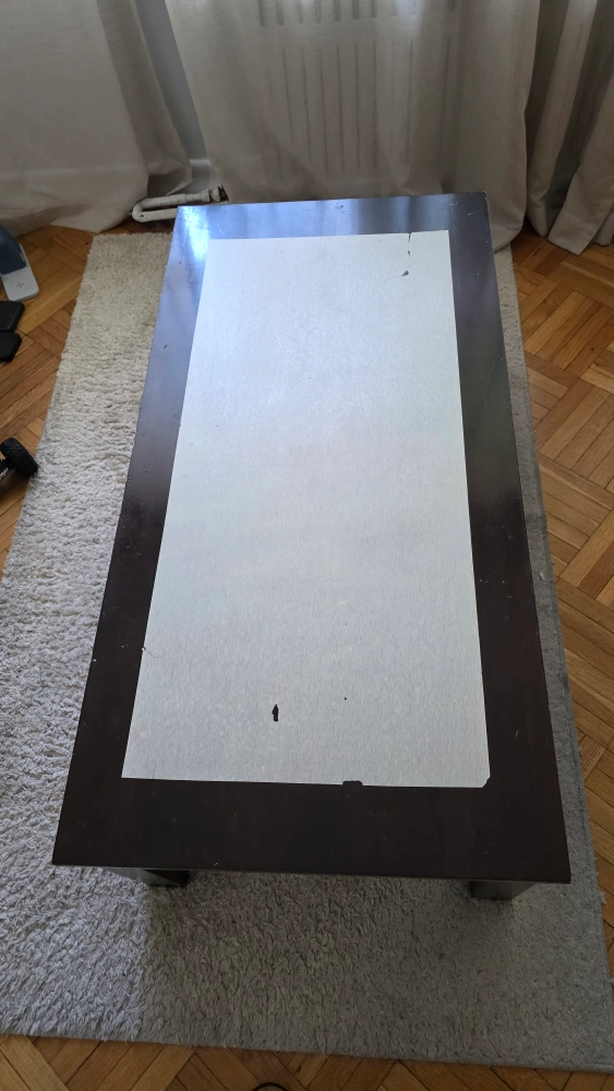Selling a coffee table with a brown frame and a white top. It's in good condition but has some chipped paint. You can use a runner or some other cloth to cover it. It would be a great addition to any living room.
