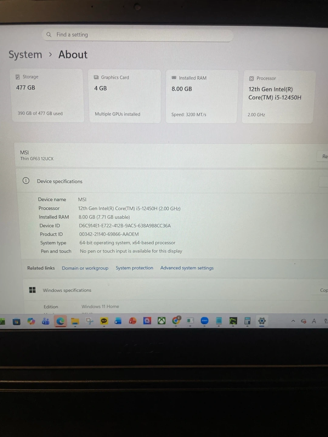 MSI Thin GF63 gaming laptop with Intel Core i5 processor and NVIDIA GeForce RTX graphics. It comes with 8GB of RAM and 477GB of storage. Runs on Windows 11 Home.