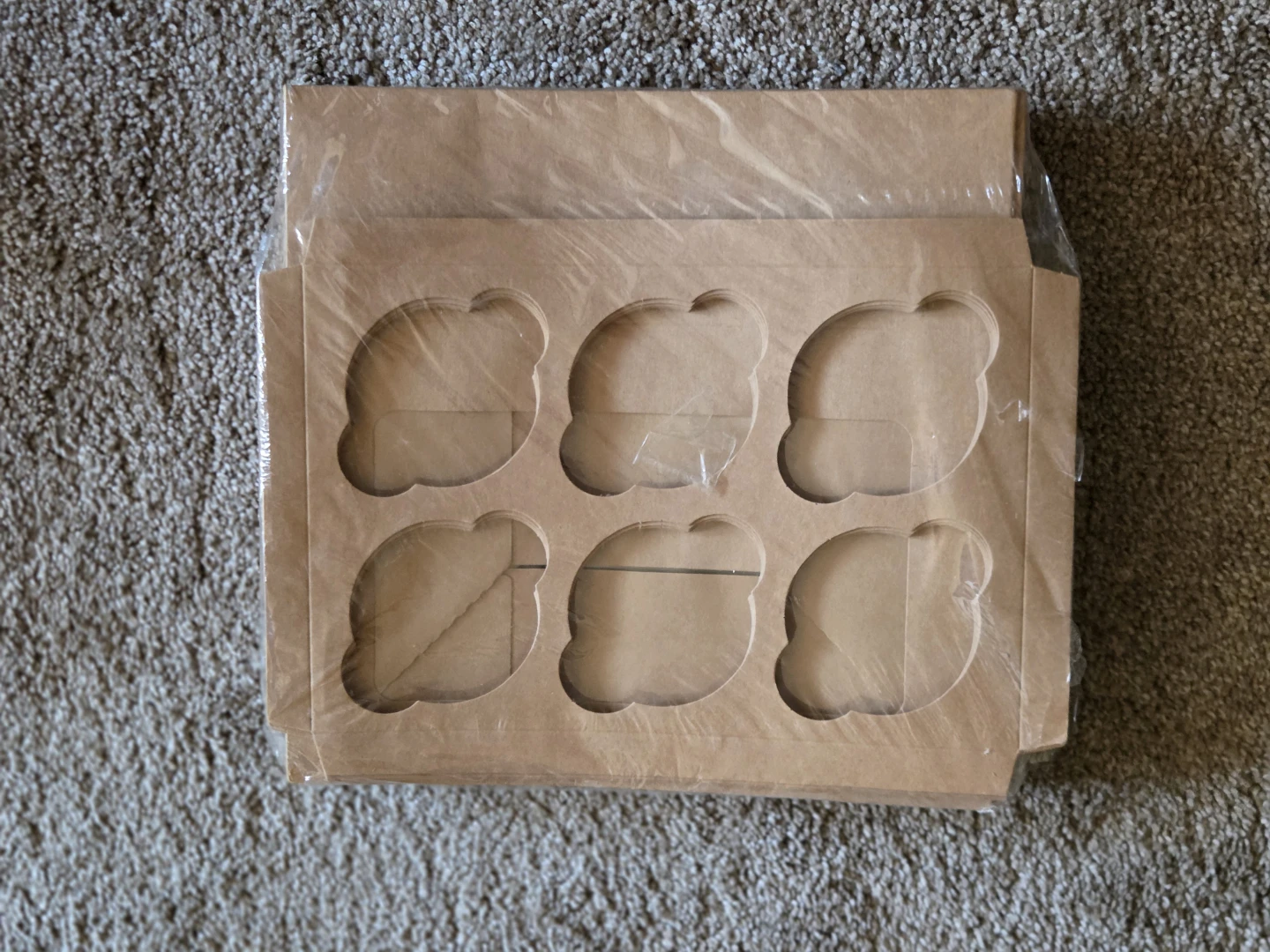 Kraft paper cupcake box with 6 individual cavities. Includes a clear plastic lid. Holds standard-sized cupcakes. Never opened