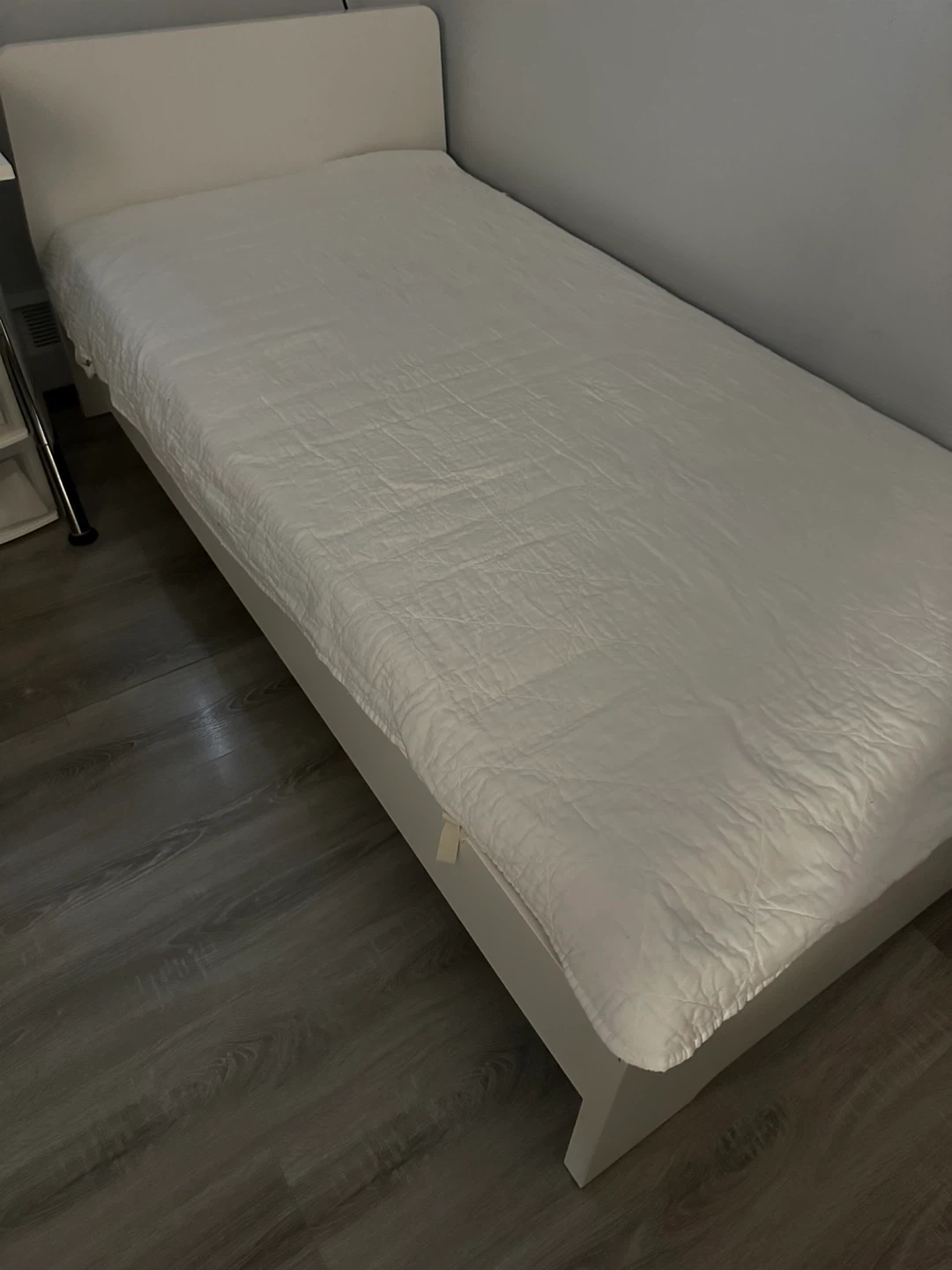 White twin bed frame with a simple headboard. It's made of a sturdy material and has a clean design. The frame comes with a quilted mattress protector. This bed would fit well in a small room or guest space.