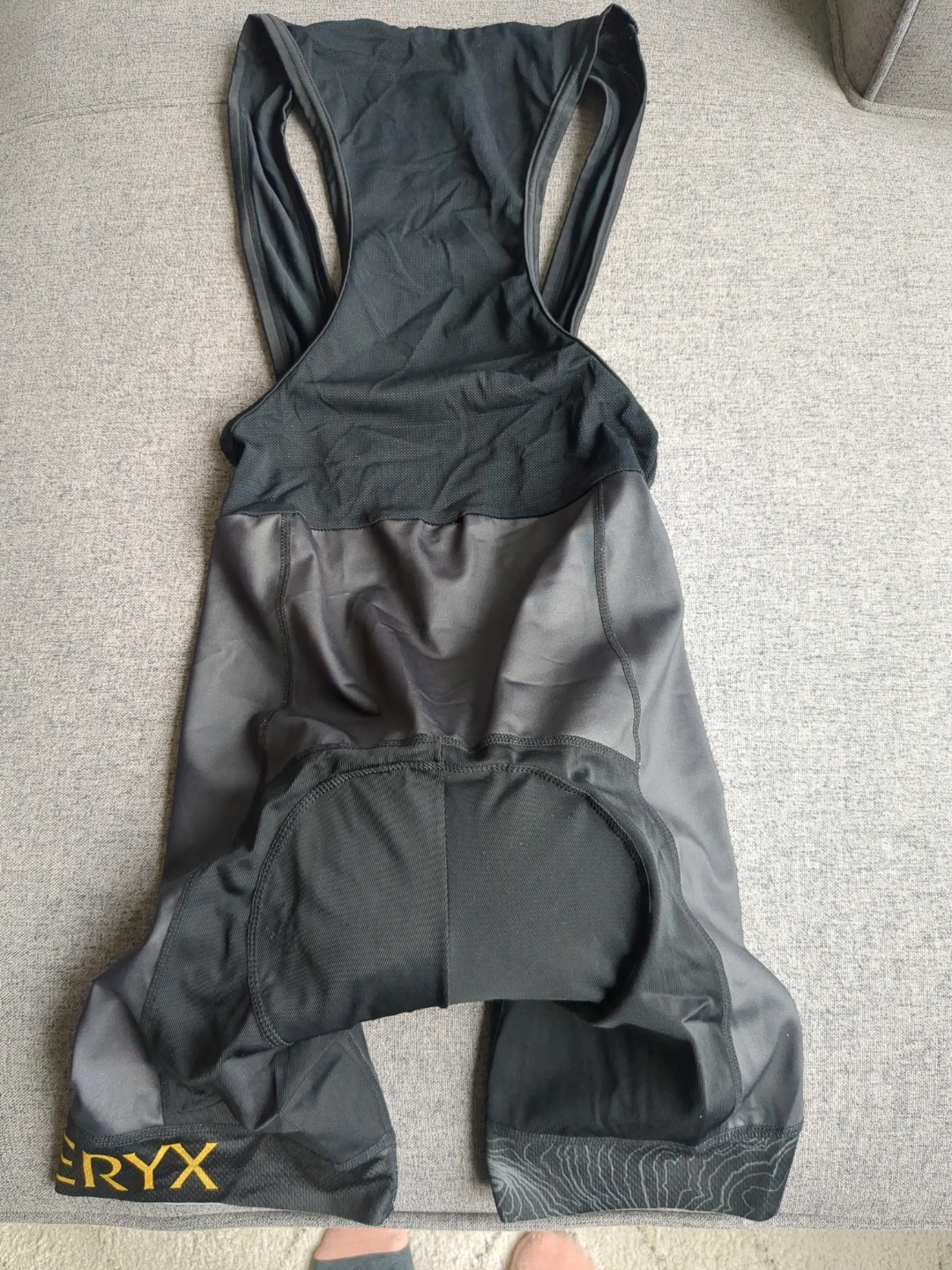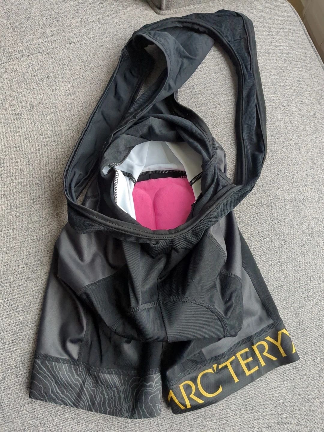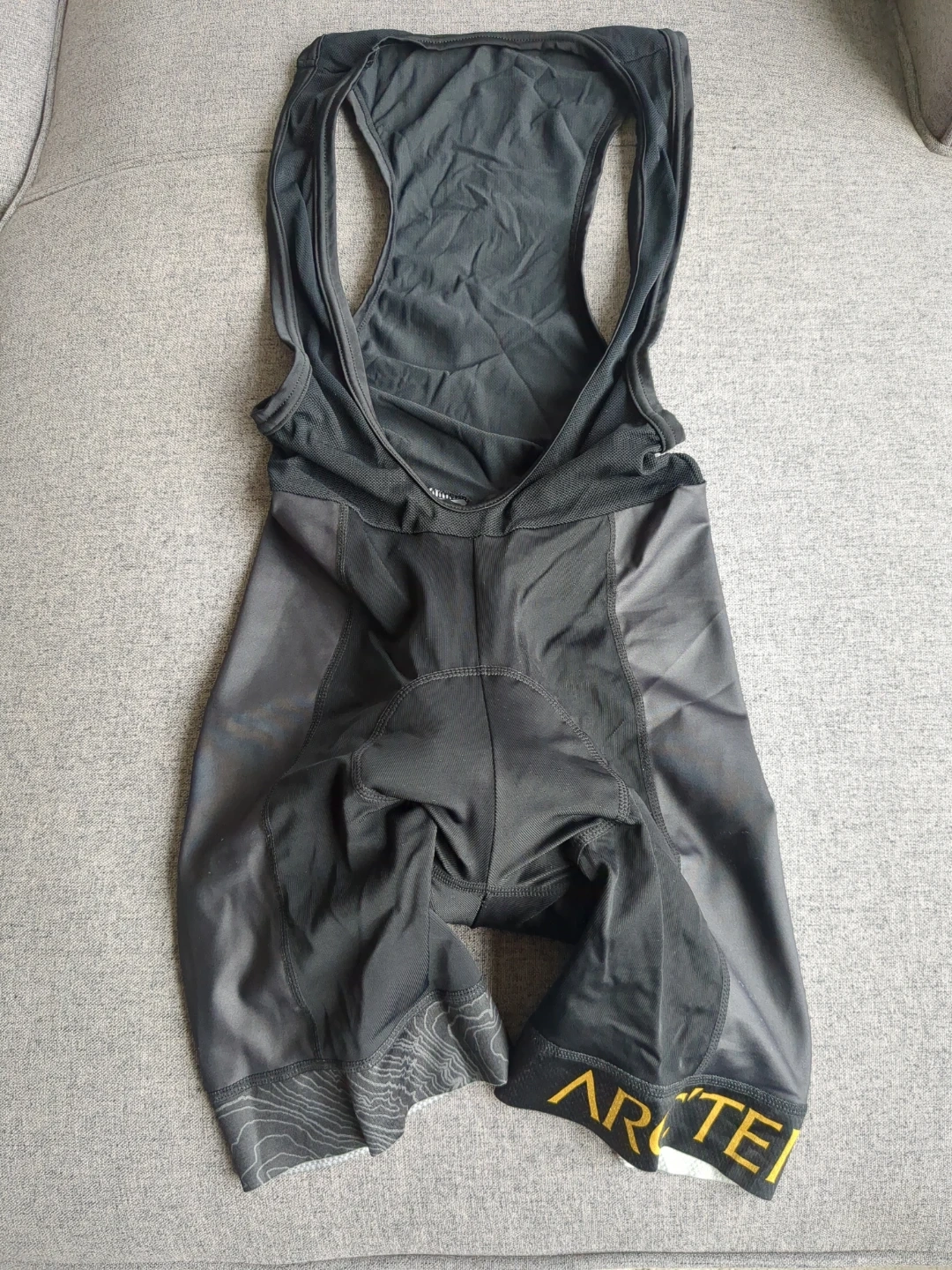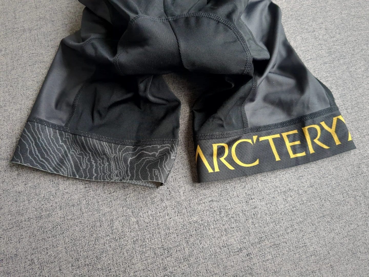 Team Arctery'x black cycling bib shorts. Padded for comfort. Features "ARC'TERYX" on the leg hems. Has grippy material on the inside of the cuff. Ideal for long rides!