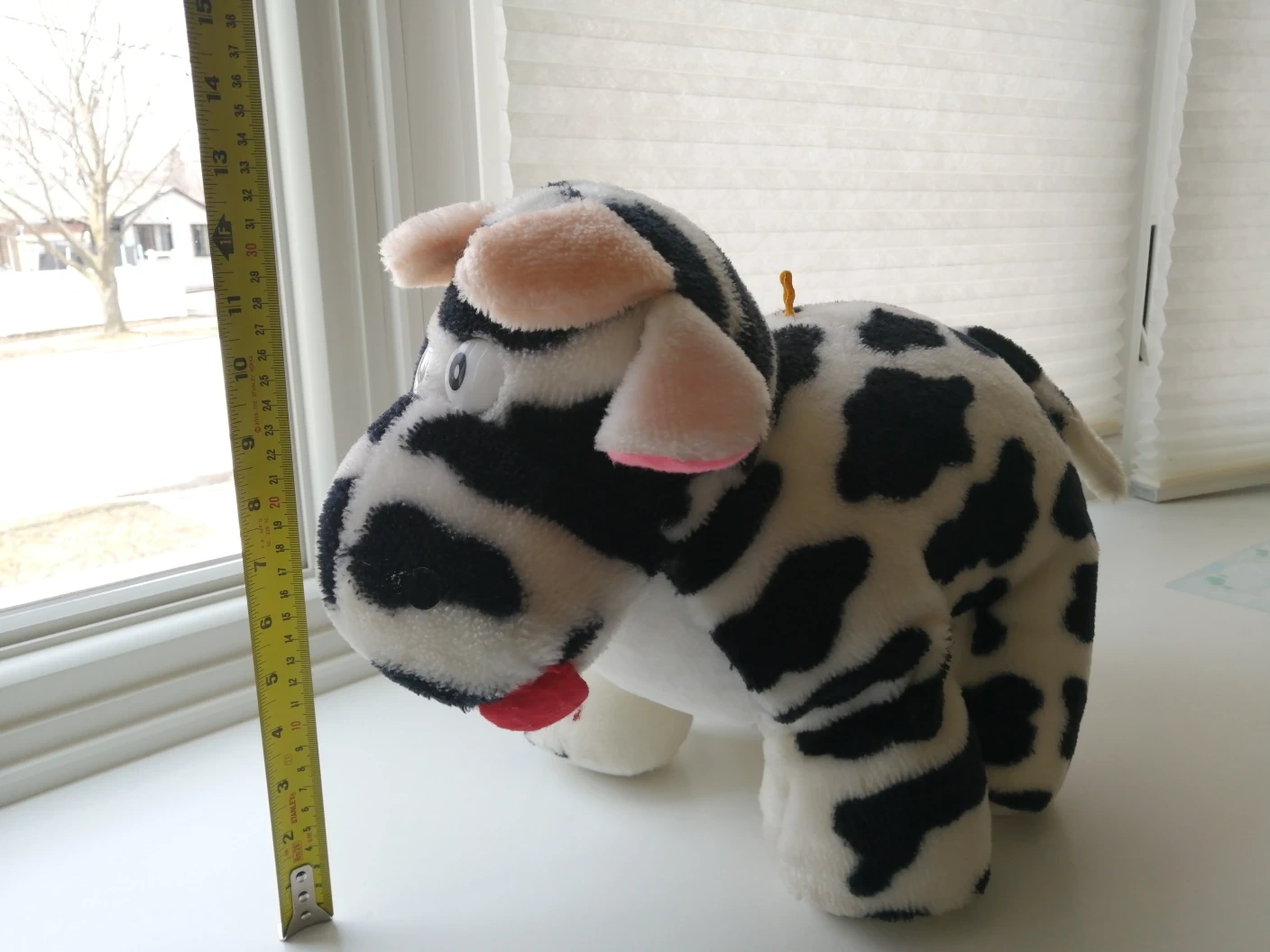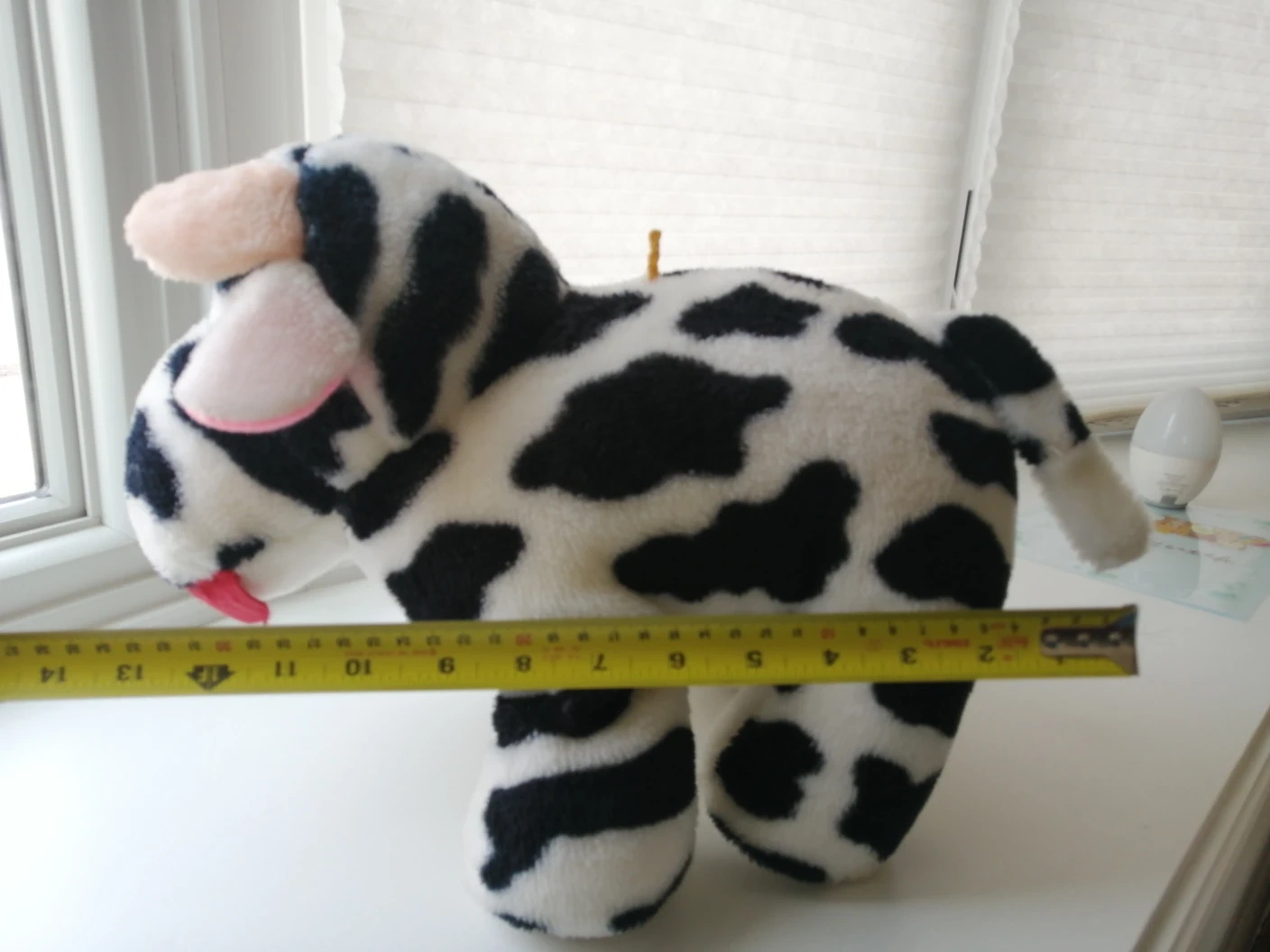 Soft plush cow stuffed animal. It's about 7 inches tall and 13 inches long.