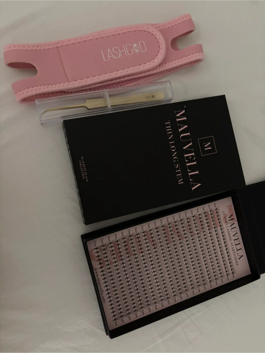 Mauvella luxury false lashes in a thin long stem collection. Includes a pink LashGod headband and gold tweezers. Various lash lengths from 10mm to 15mm are included.
