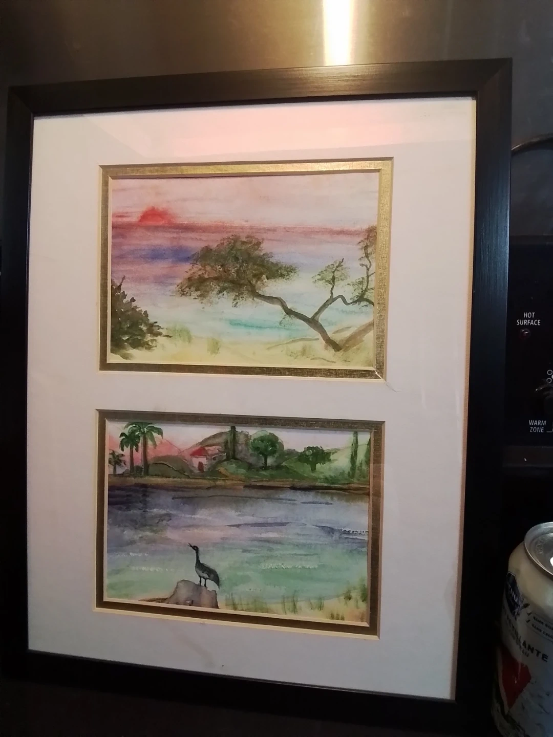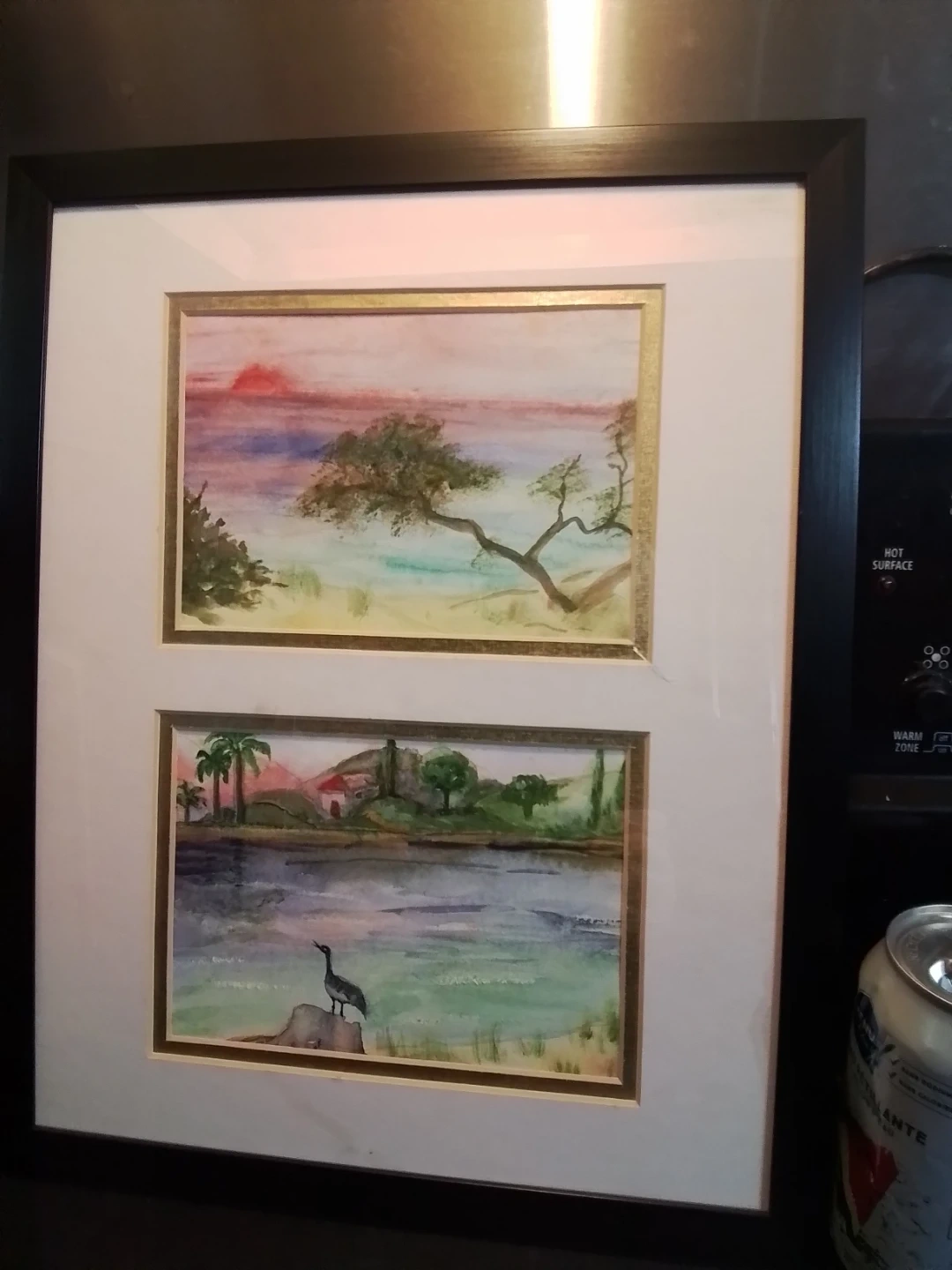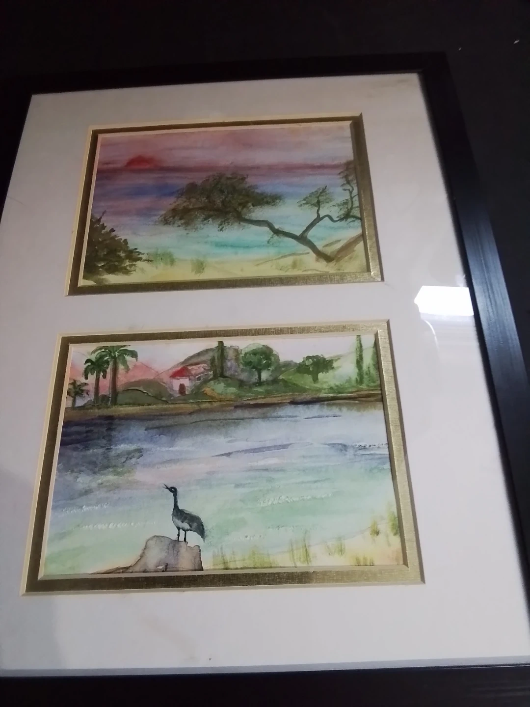 This framed piece features two lovely watercolour paintings, each capturing serene landscapes within a 12x15 inch frame. The artwork is in good condition, showcasing delicate brushwork and soothing colour palettes. The frame is black. This beautiful piece could bring a touch of calm to any room.