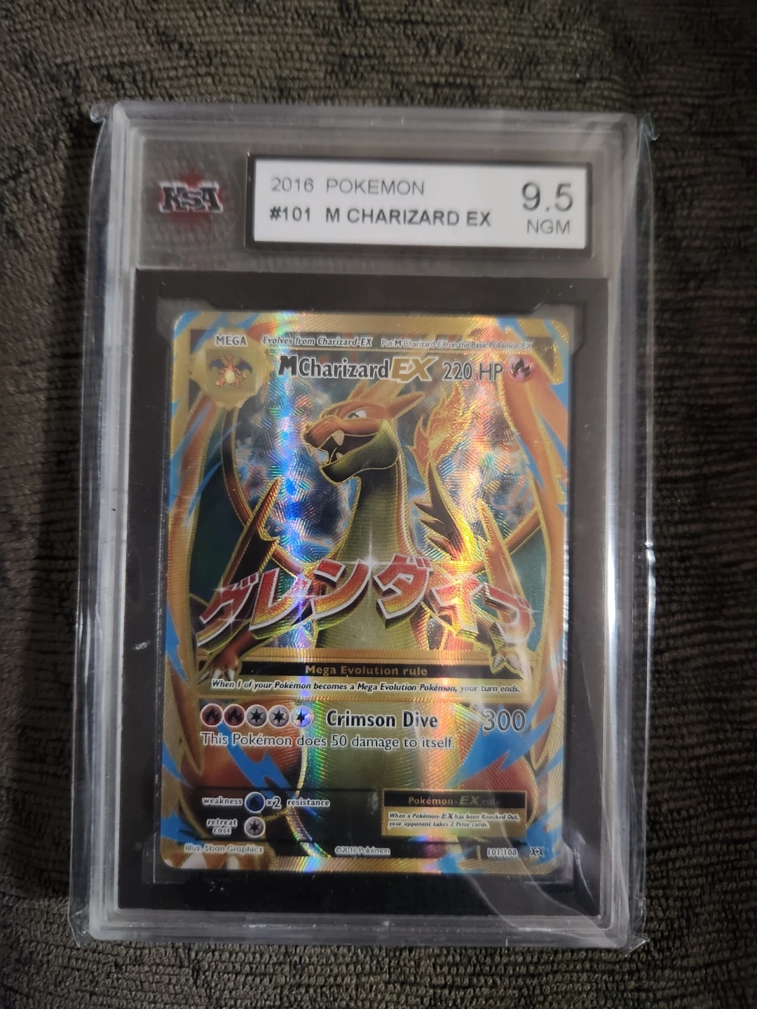 This is the 2016 Pokemon M Charizard EX trading card, number 101. It's graded 9.5 NGM by KSA. The card features M Charizard EX with 220 HP and the Crimson Dive attack.