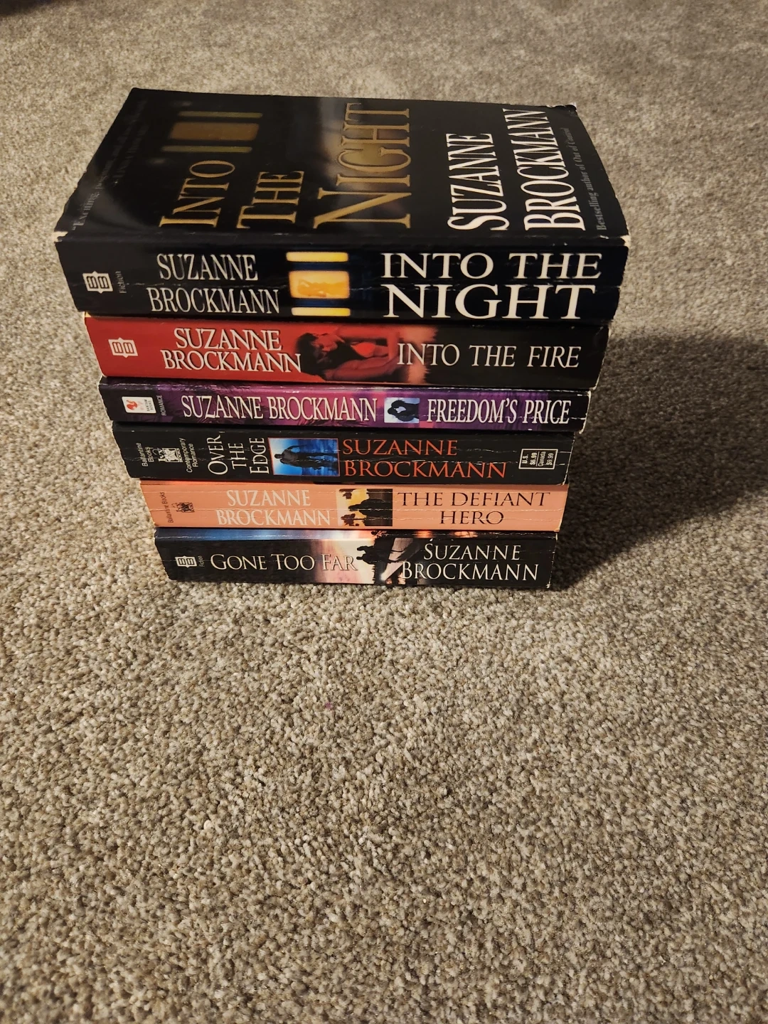 A collection of six New York Times bestselling novels by Suzanne Brockmann. Titles include 'Into The Night', 'Into The Fire', 'Freedom's Price', 'Over The Edge', 'The Defiant Hero', and 'Gone Too Far'. These paperbacks are part of the Troubleshooters series. A great addition for fans of romantic suspense!