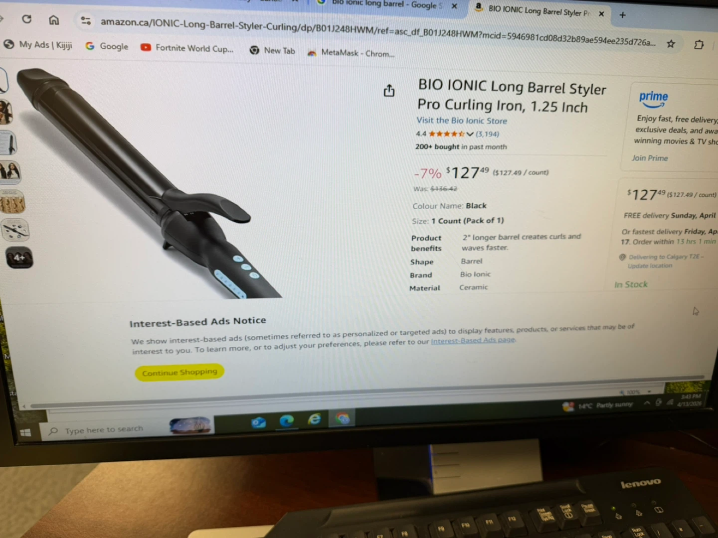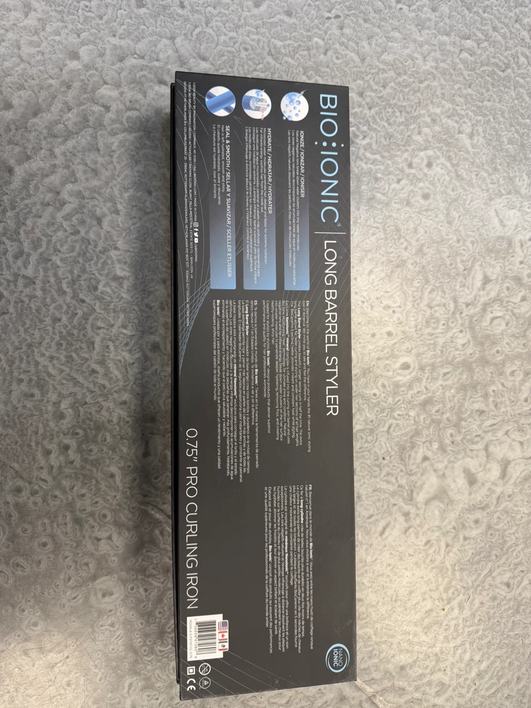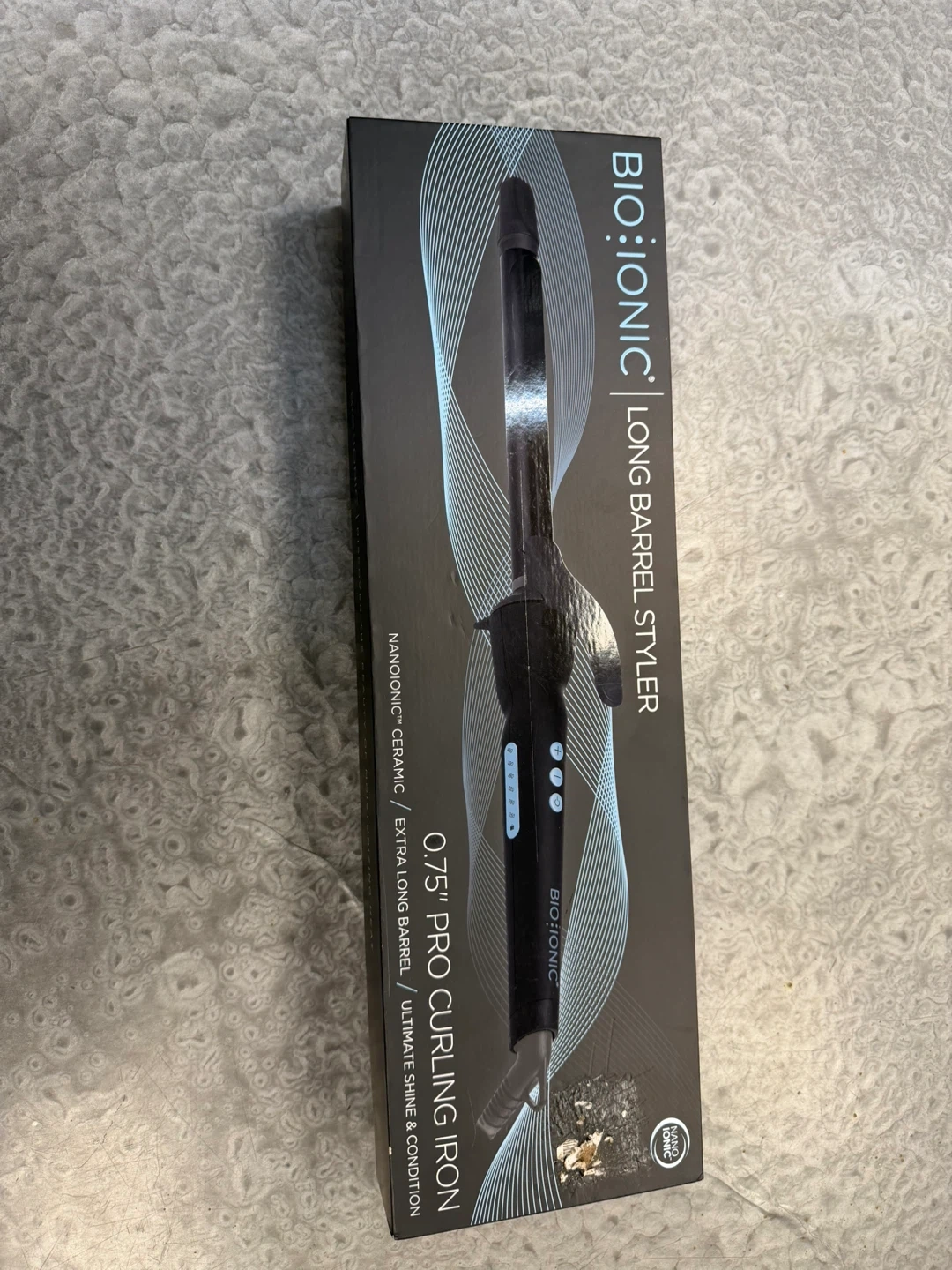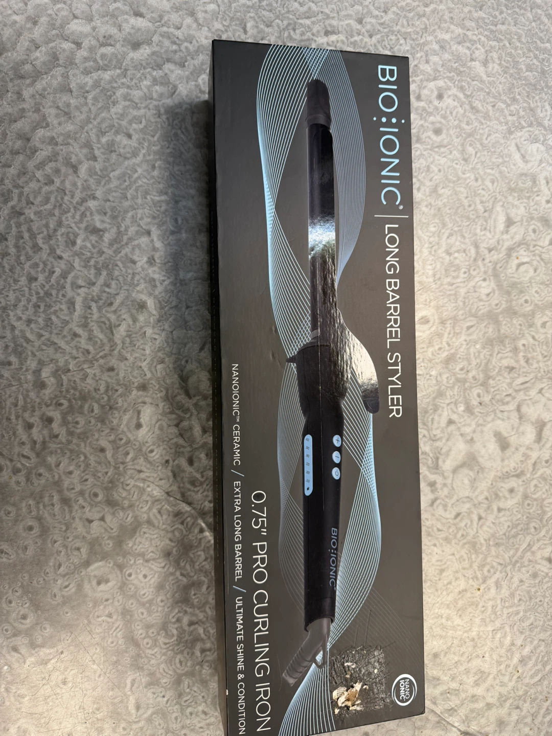 This is a Bio Ionic Long Barrel Styler Pro Curling Iron. It features a 0.75 inch barrel made of Nano-Ionic Ceramic. The iron is black and includes its original box. Brand new.
