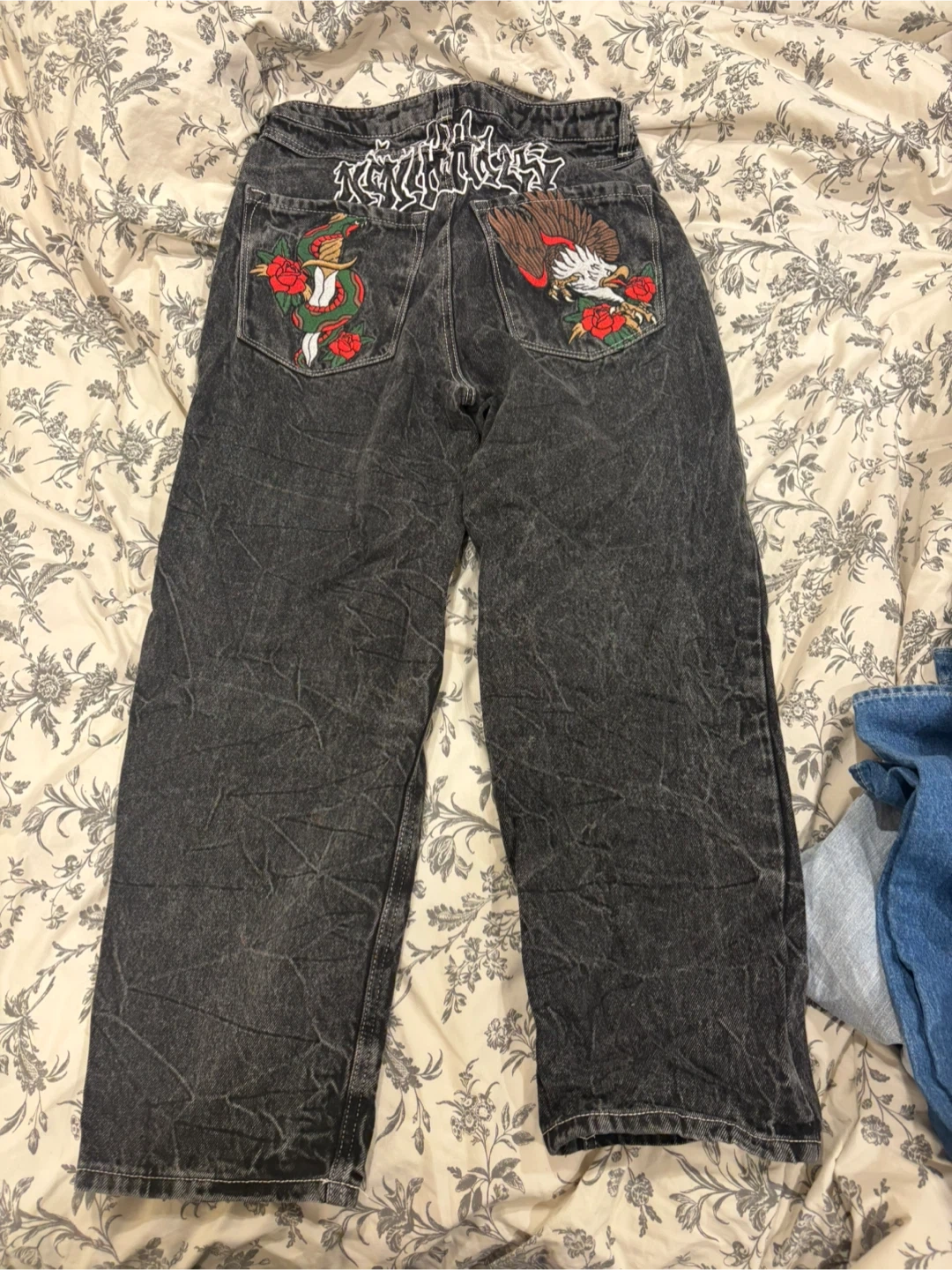 These jeans feature eye-catching embroidered designs on the back pockets, including a dragon, a panther with flames, and a rose motif. They're made of denim and come in various washes. These would be great for adding some flair to your everyday outfits!