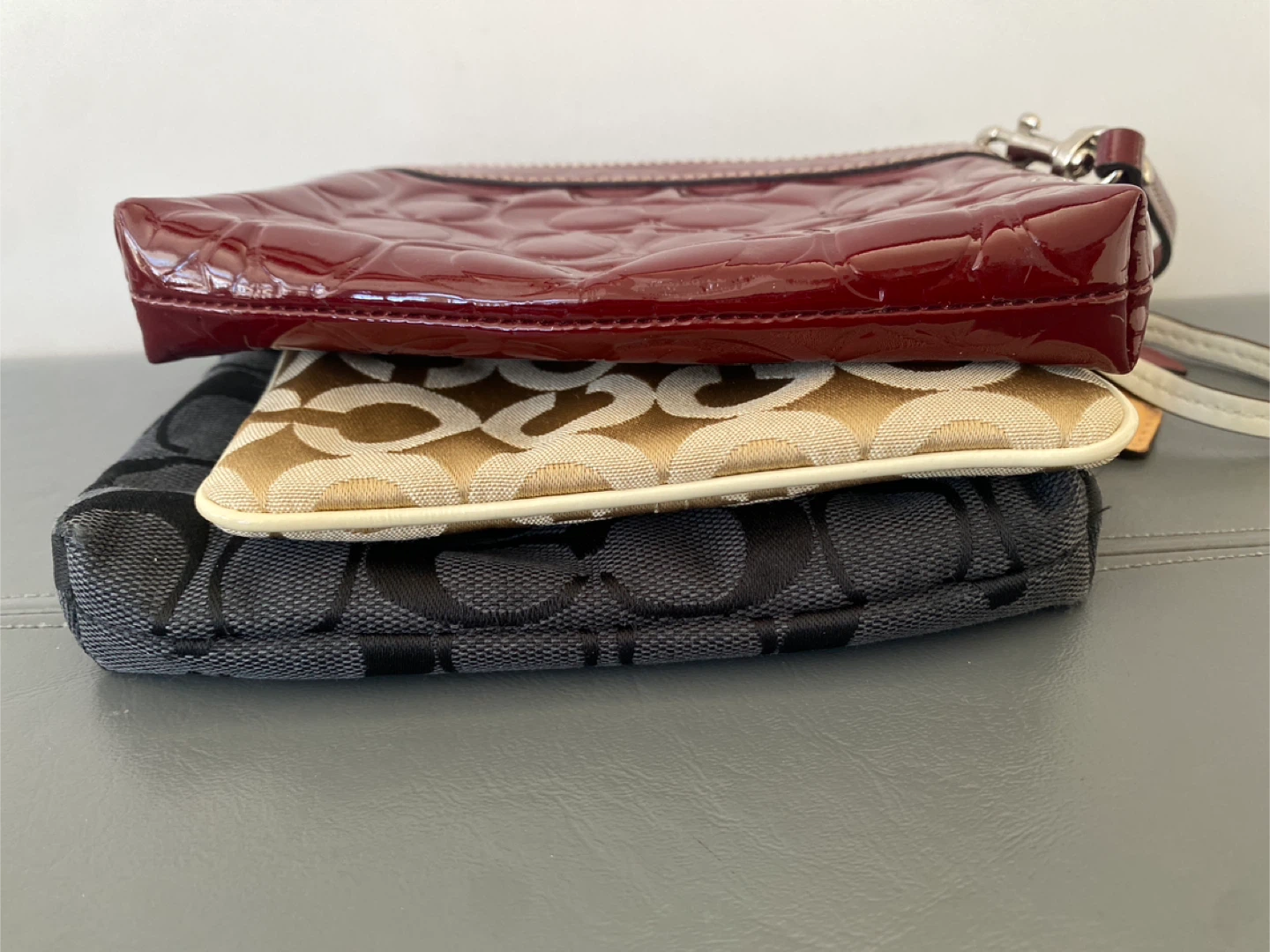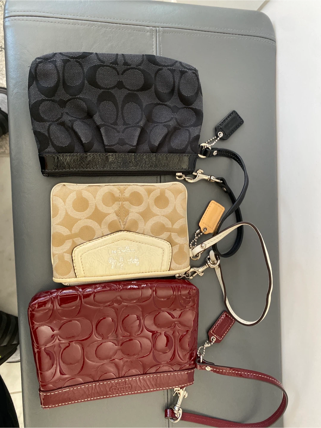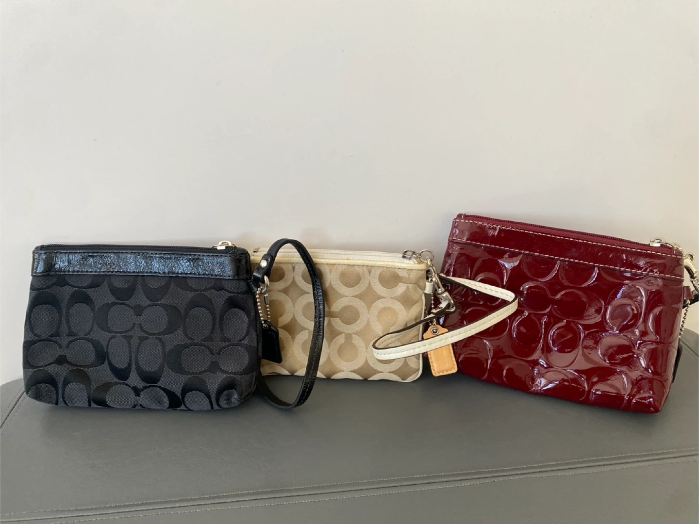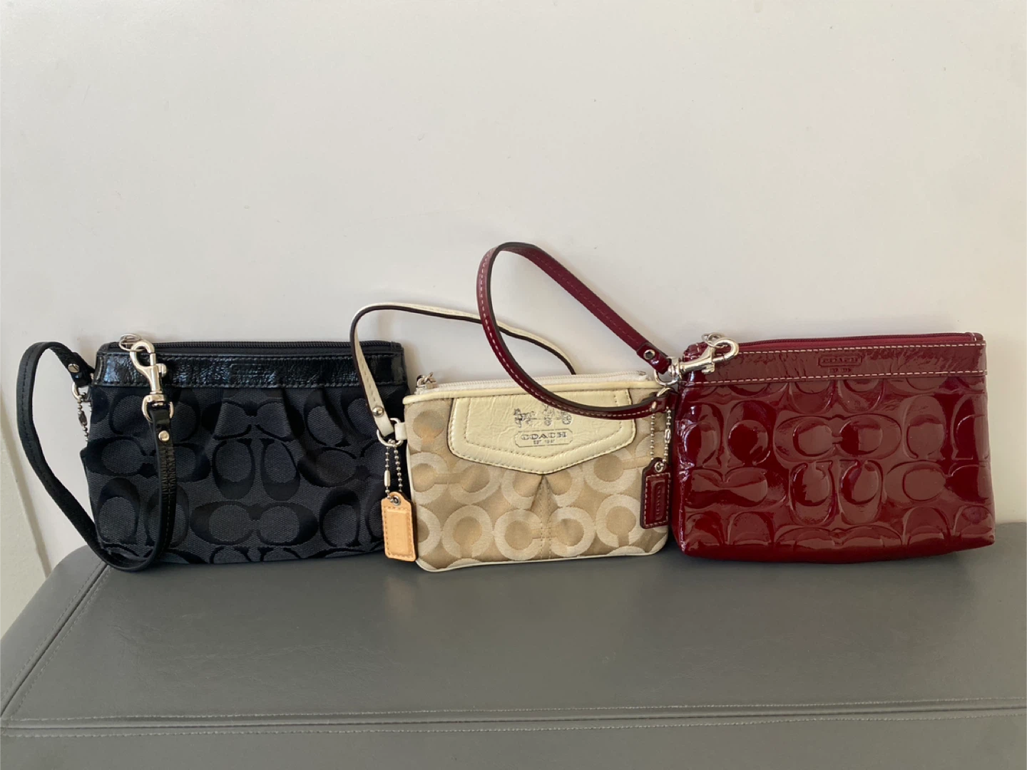 A set of three Coach wristlets. Includes a black fabric wristlet with the signature 'C' pattern, a tan and cream fabric wristlet with a cream leather trim featuring the Coach logo, and a burgundy patent leather wristlet with an embossed signature 'C' pattern. All three have wrist straps and zip closures.