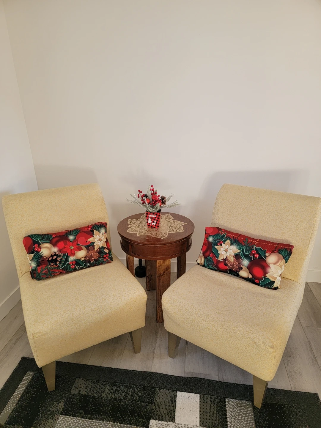A set of two matching accent chairs in a pale yellow fabric. They have a textured pattern and silver-toned legs. Pillows shown are not included.