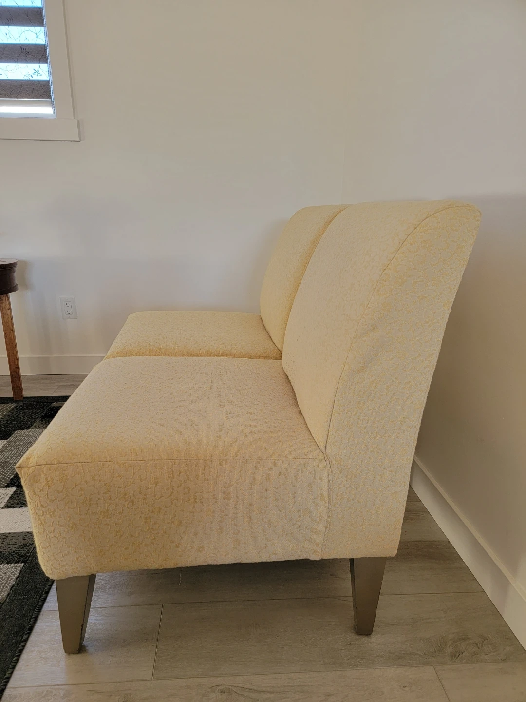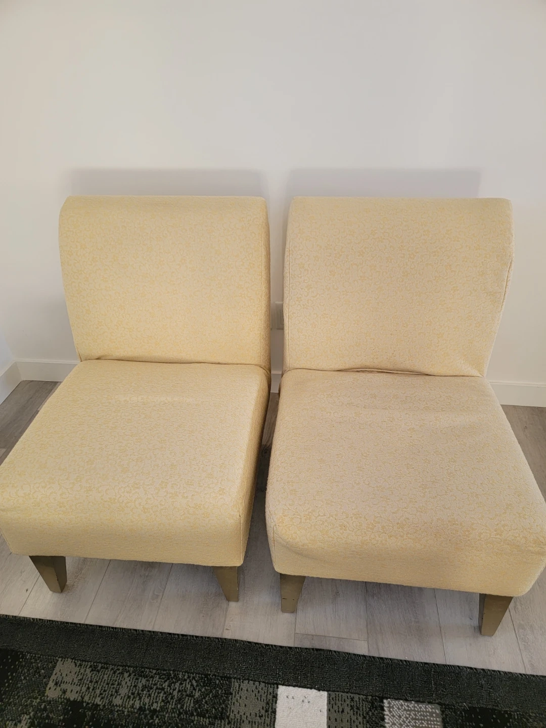 A set of two matching accent chairs in a pale yellow fabric. They have a textured pattern and silver-toned legs. Pillows shown are not included.