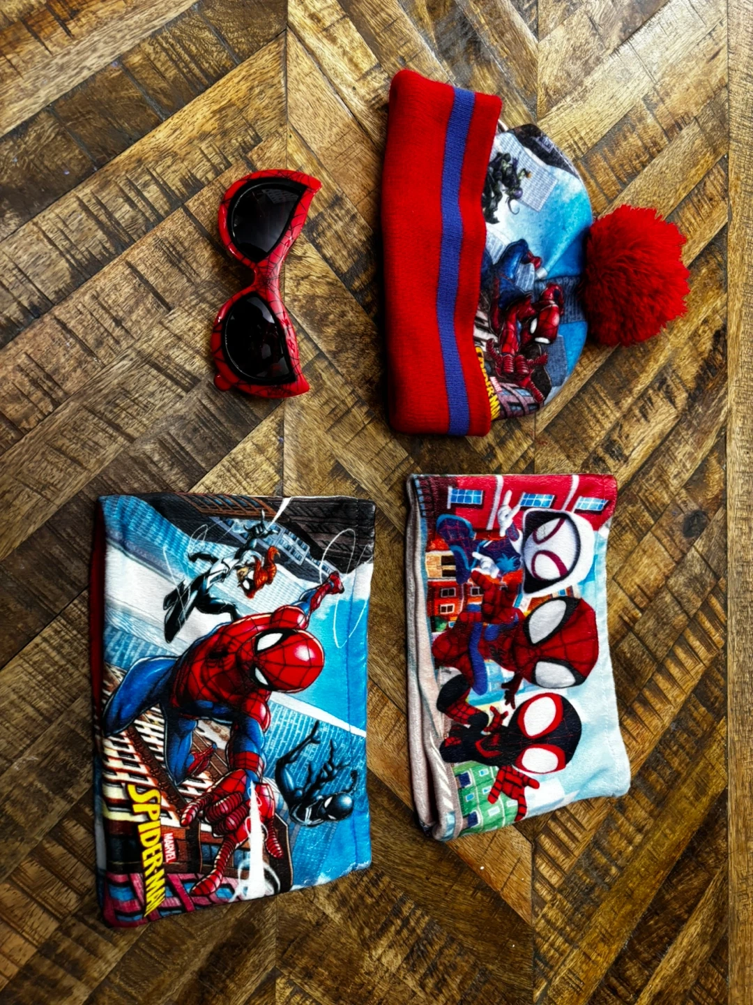This Spiderman set includes a winter toque, sunglasses, and two neck warmers.All items feature vibrant Spiderman graphics. They're perfect for young Marvel fans!