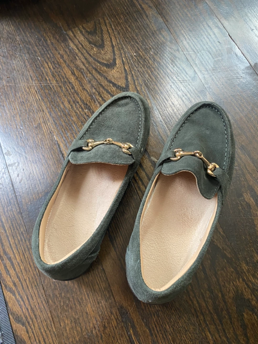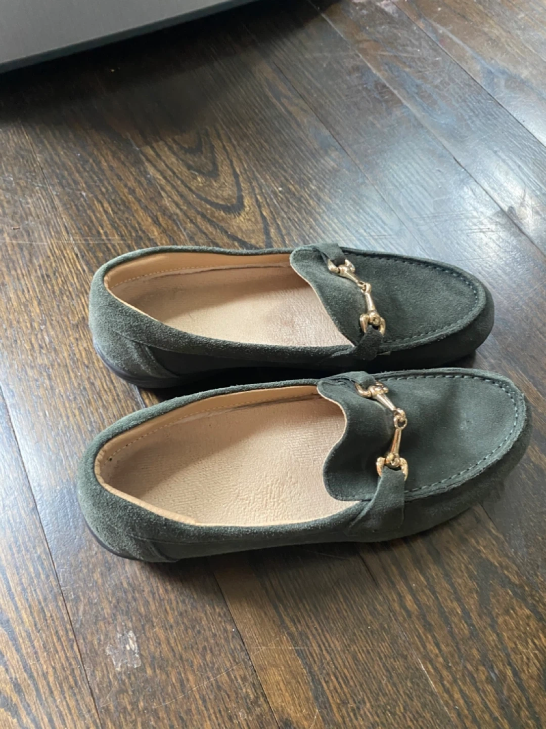 Stylish dark green suede loafers for women. Features a classic gold horsebit detail across the vamp. Comfortable light tan interior lining. Perfect for dressing up or down!
