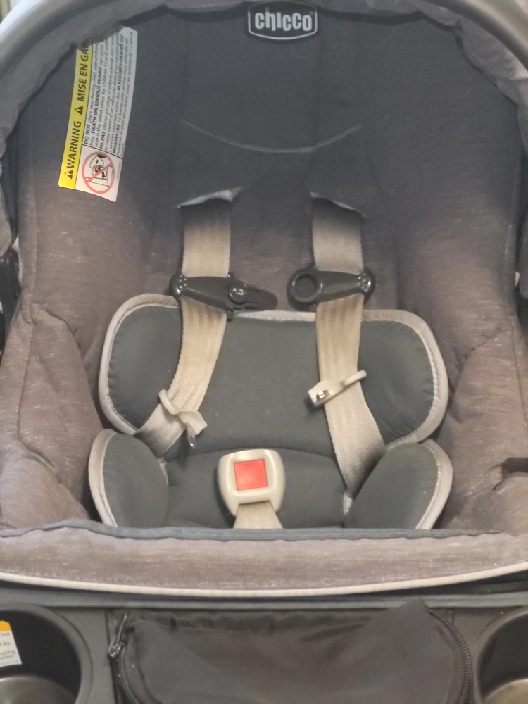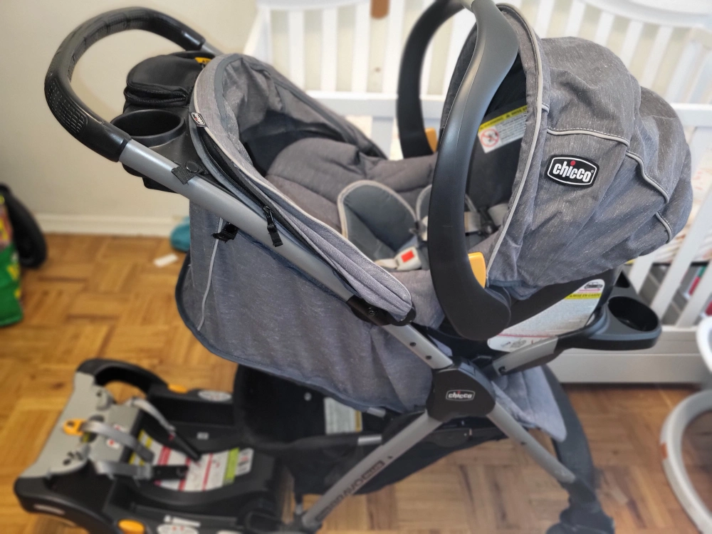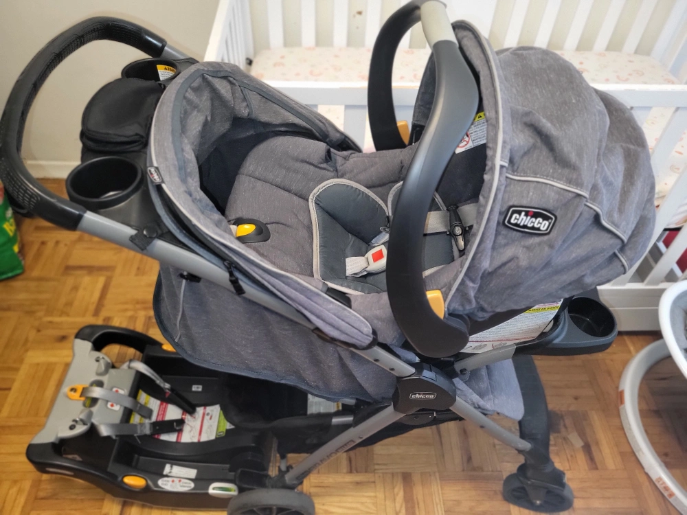 This is a Chicco KeyFit 30 car seat and stroller combo. The stroller features a canopy, cupholders, and a storage basket. The car seat is compatible with the stroller. The set is in like new condition.