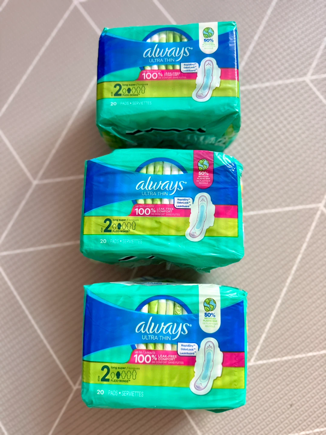Selling new unopened three packs of Always Ultra Thin pads. They are the long super size and each pack contains 20 pads. These pads feature RapidDry, OdorLock, and LeakGuard technologies for comfort and protection