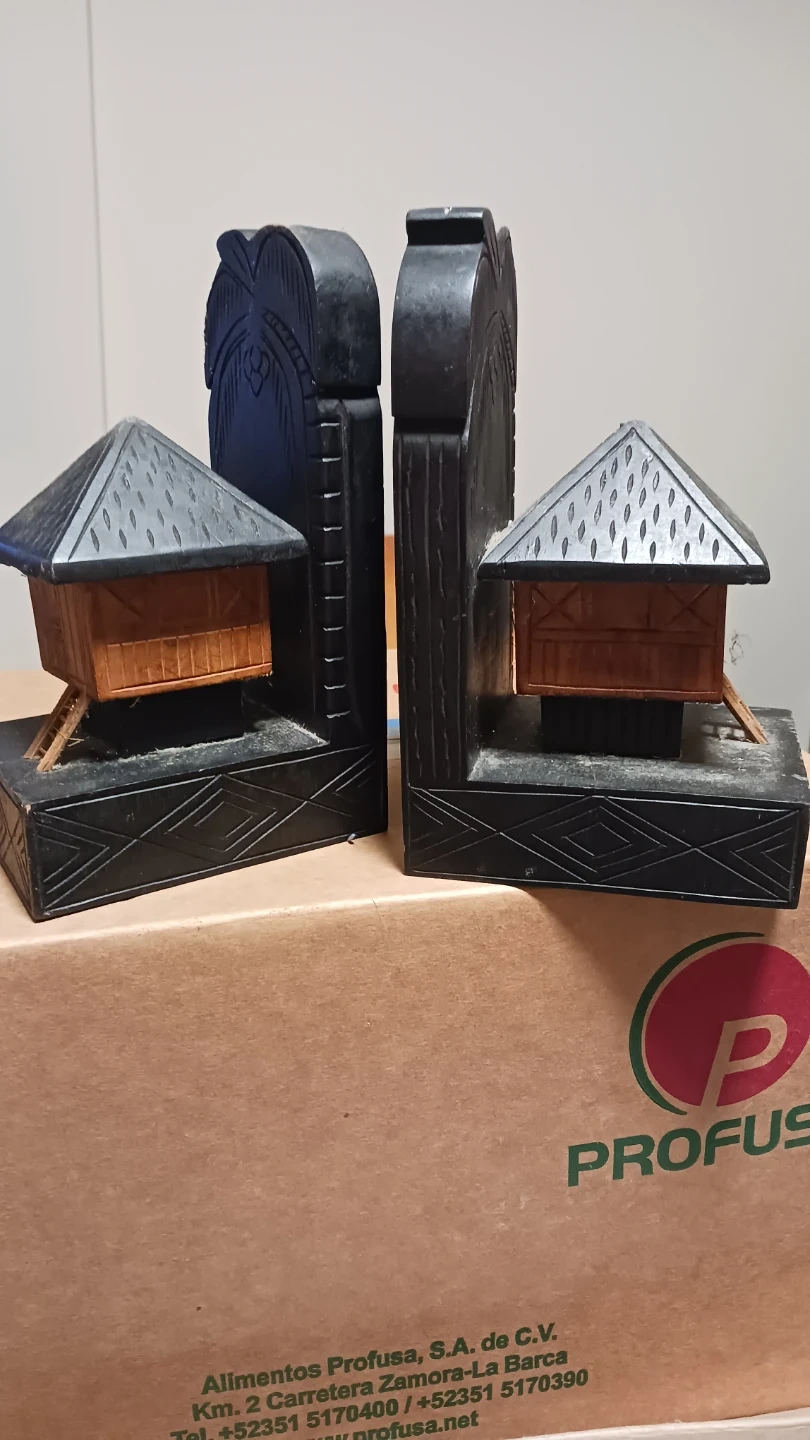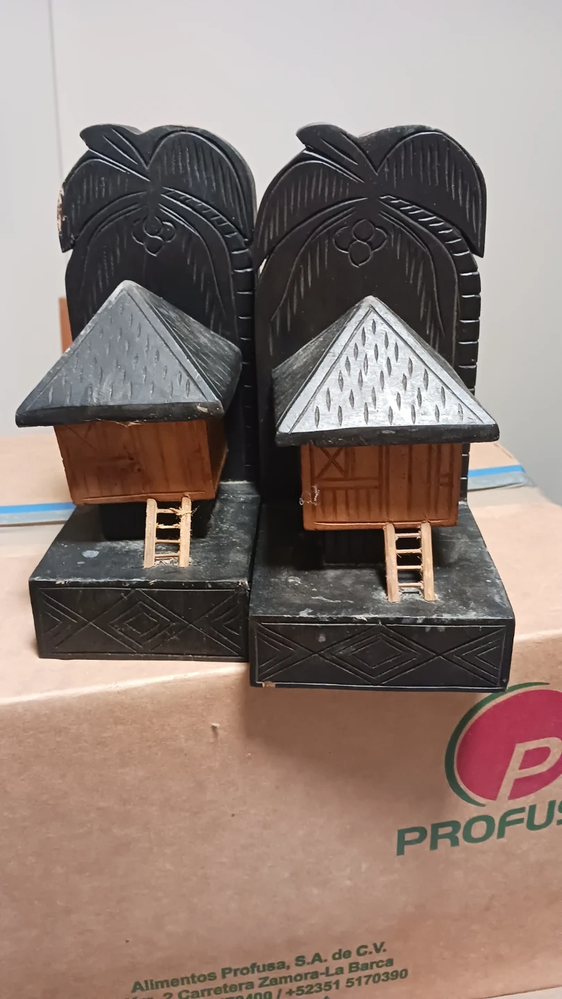 A pair of Africab Blackwood bookends, each featuring a small, carved tropical house with a thatched roof. These decorative pieces add a touch of charm to any bookshelf. Carved palm tree details on the back support. Wood construction.