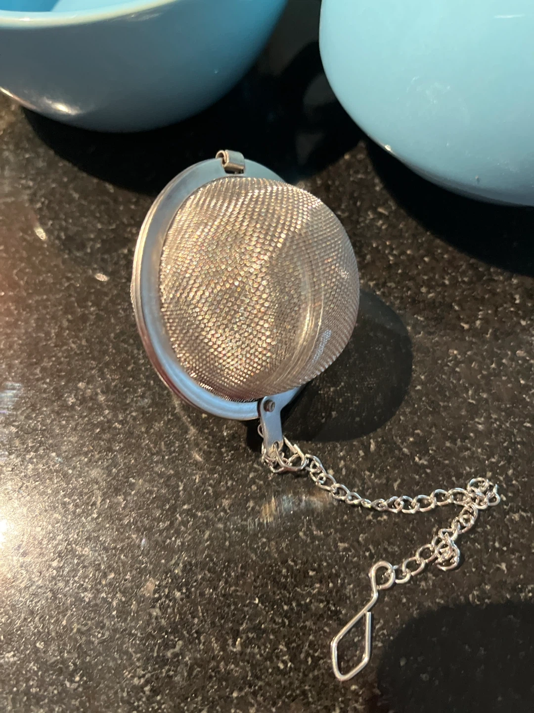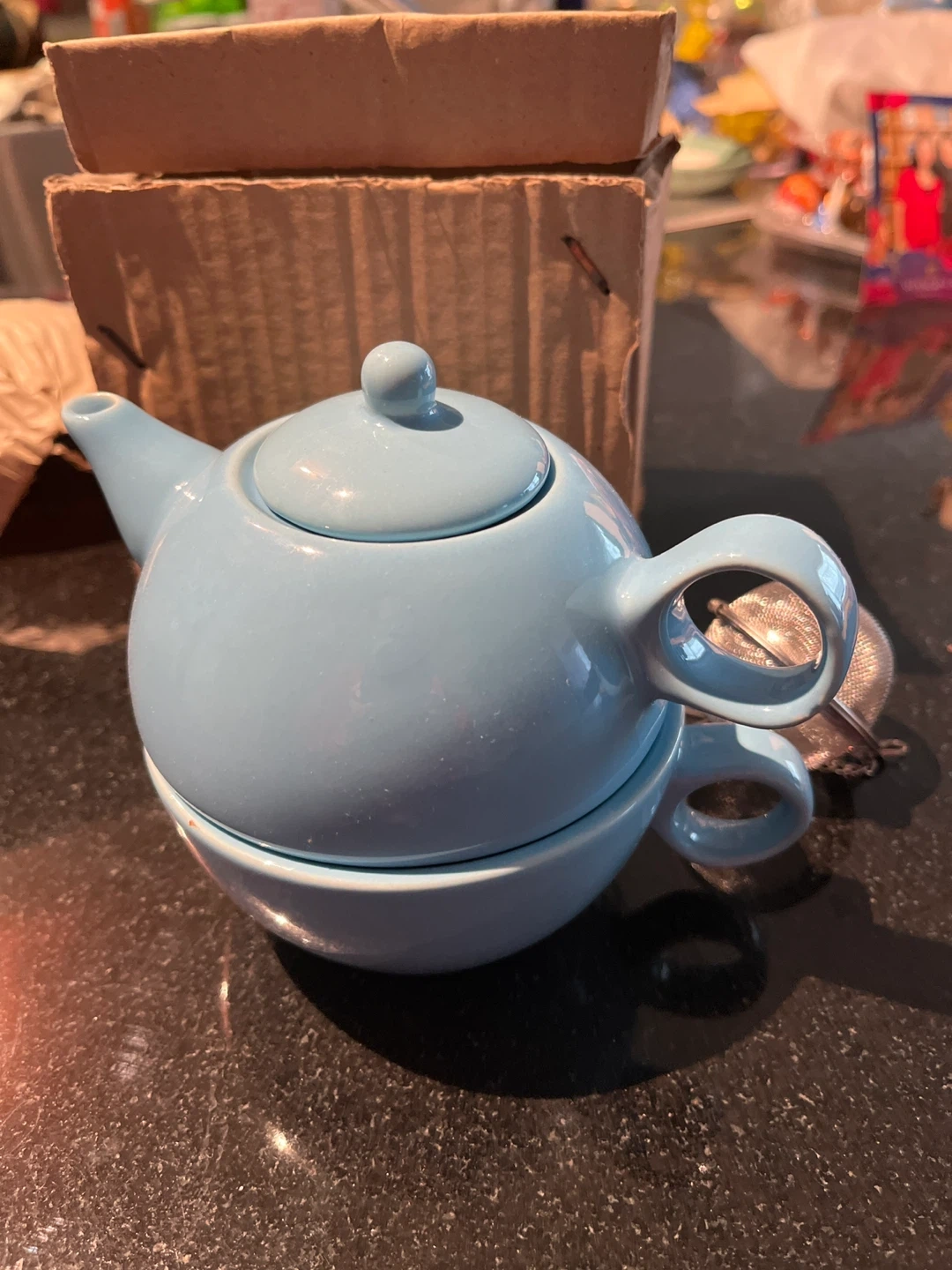 This is a 1 cup teapot set from Old Amsterdam Porcelain Works. It includes a teapot, a cup, and a tea infuser. The set is microwave and dishwasher safe. It's great for enjoying a single serving of tea!