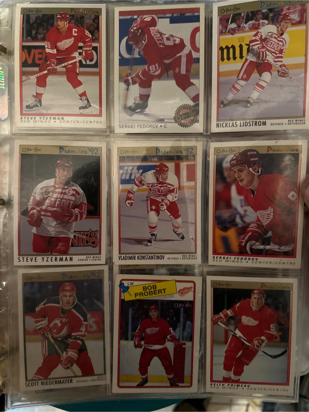 Selling a collection of O-Pee-Chee Premier '92 hockey cards. Includes players like Steve Yzerman, Sergei Fedorov, Nicklas Lidstrom, Vladimir Konstantinov, Bob Probert, and Scott Niedermayer. A great addition for any hockey card collector!