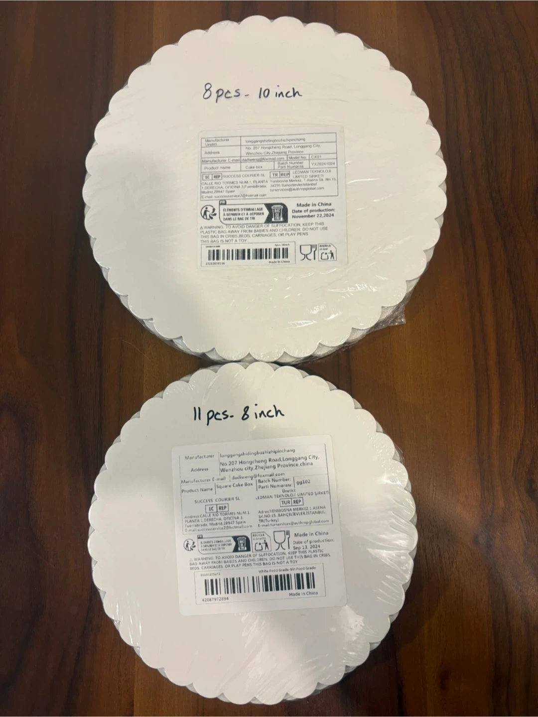 White food-grade cake boards for baking. Includes 8 pieces of 10-inch boards and 11 pieces of 8-inch boards. Date of production for 10-inch boards is November 22, 2024. Date of production for 8-inch boards is September 13, 2024.