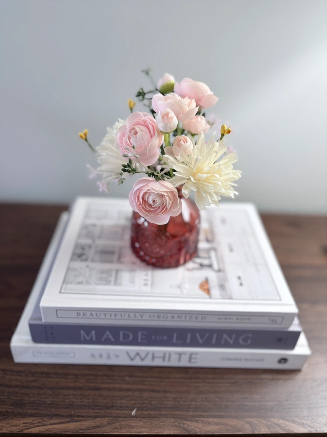 A lovely faux flower arrangement featuring pink roses and white dahlias in a decorative amber glass vase. It's perfect for adding a touch of colour to any room. The vase has a textured pattern.
