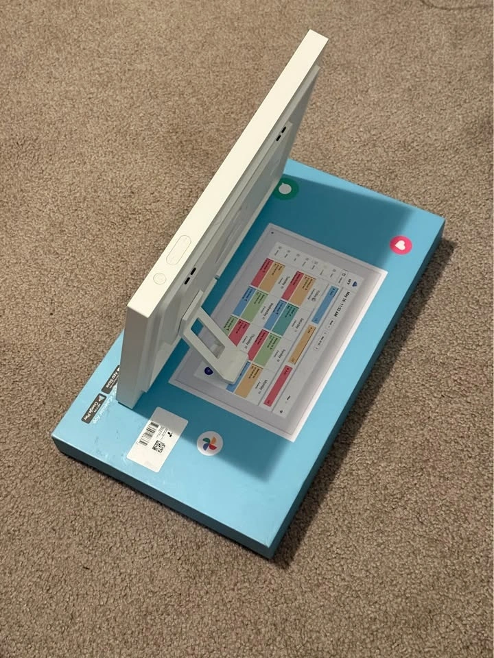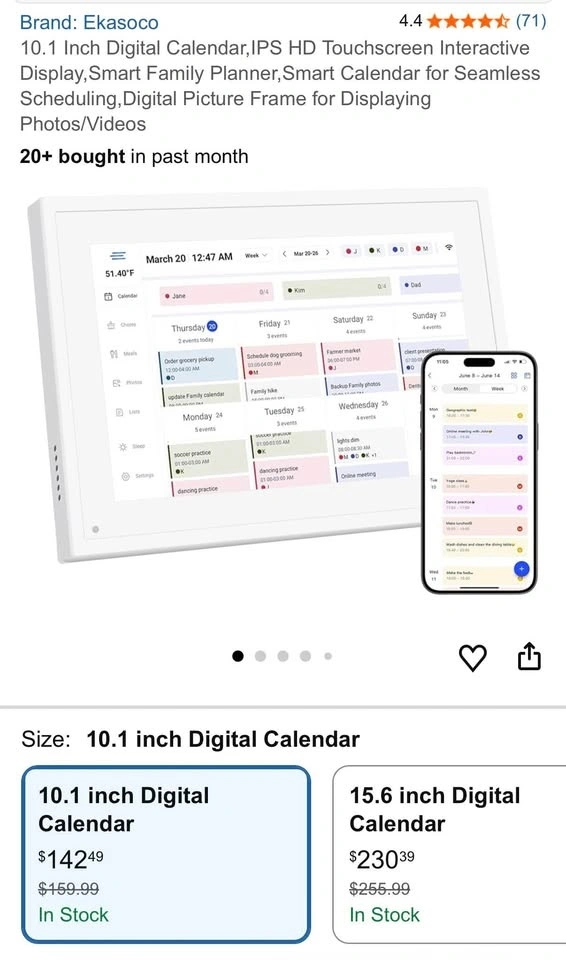 New digital calendar with a 10.1 inch IPS touch screen. Connects with Wi-Fi 2.4G/5G. Runs on Android 10 with 2G RAM and 32G ROM. Compatible with Google Calendar, iCloud Calendar, Outlook Calendar, Cozi, and Yahoo.