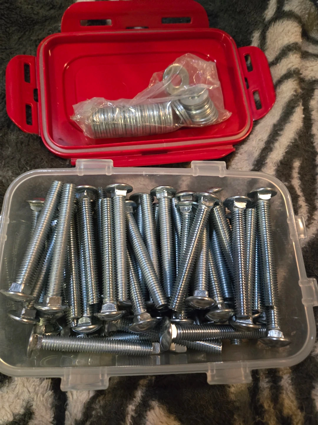 A collection of assorted bolts and nuts, suitable for various fastening needs. Includes a significant quantity of bolts and a bag of matching nuts. These are metal fasteners for construction or repair projects. 36 total 4 1/4