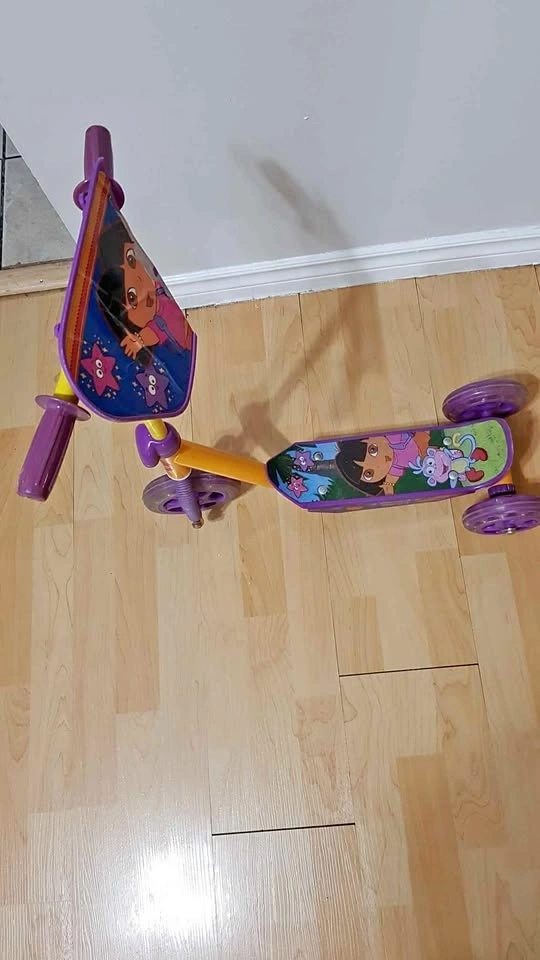 Colorful Dora the Explorer scooter with 3 wheels for stability. Purple and yellow colors. Great for little ones learning to ride!