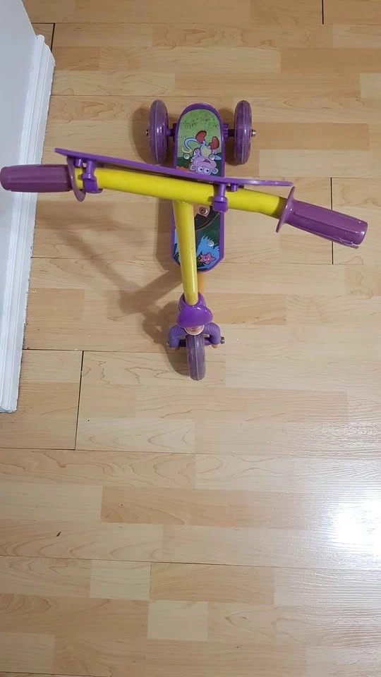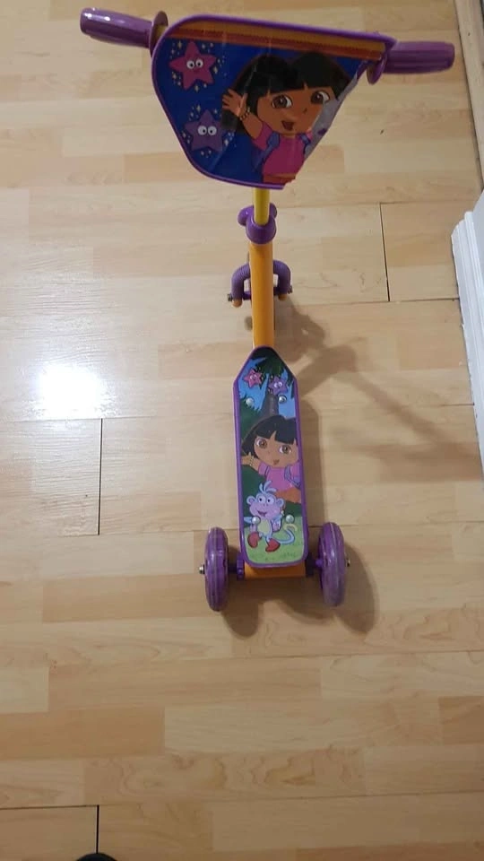 Colorful Dora the Explorer scooter with 3 wheels for stability. Purple and yellow colors. Great for little ones learning to ride!