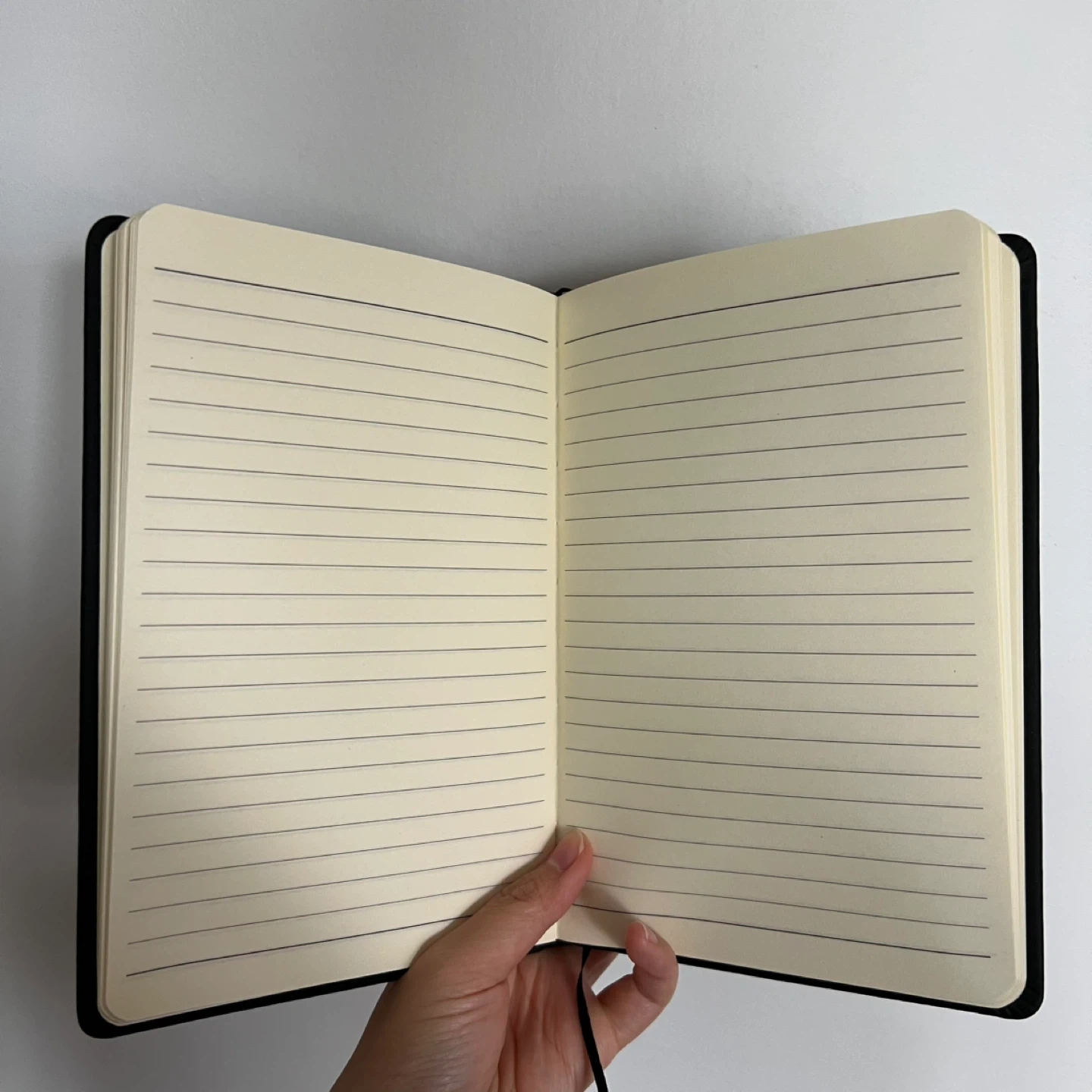 Set of two lined notebooks. One black notebook with Rakuten Kobo branding. One orange notebook with Optimism University branding. Both have elastic closures and ribbon bookmarks.