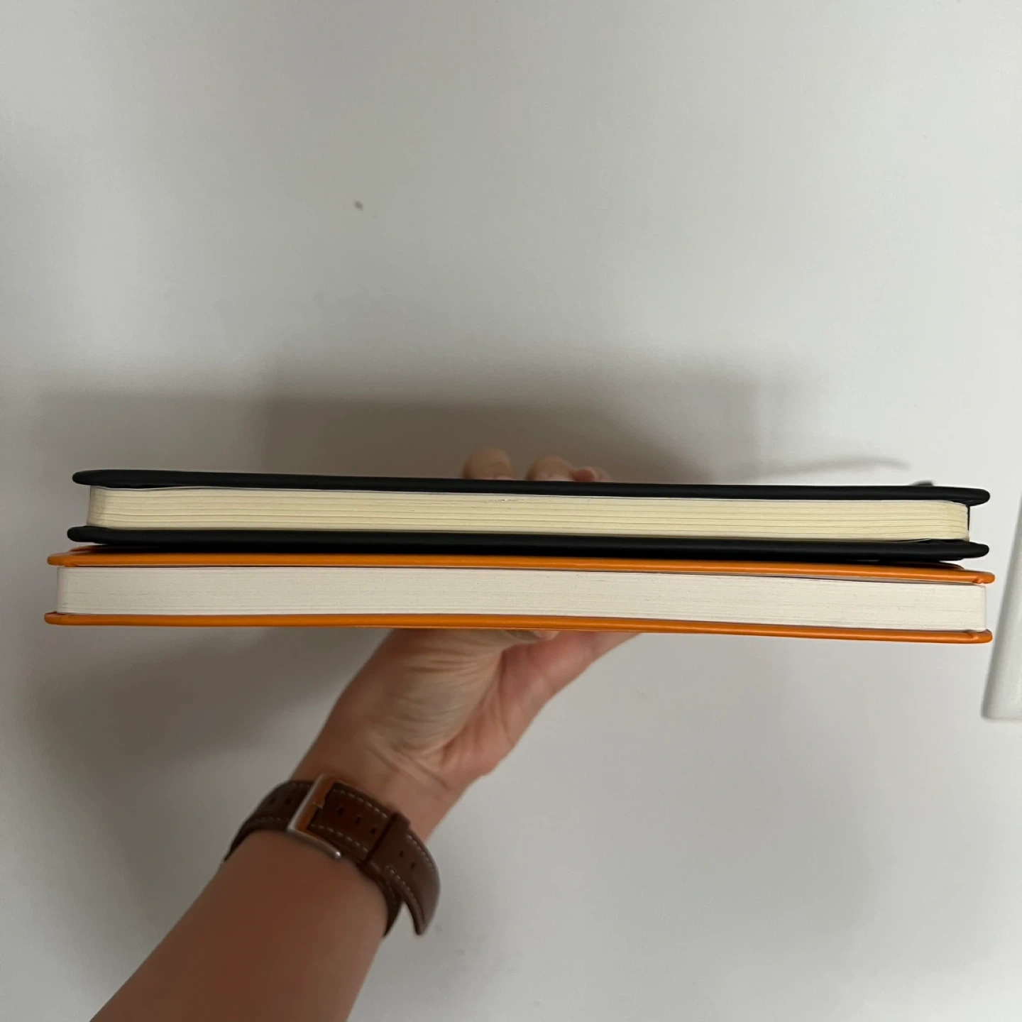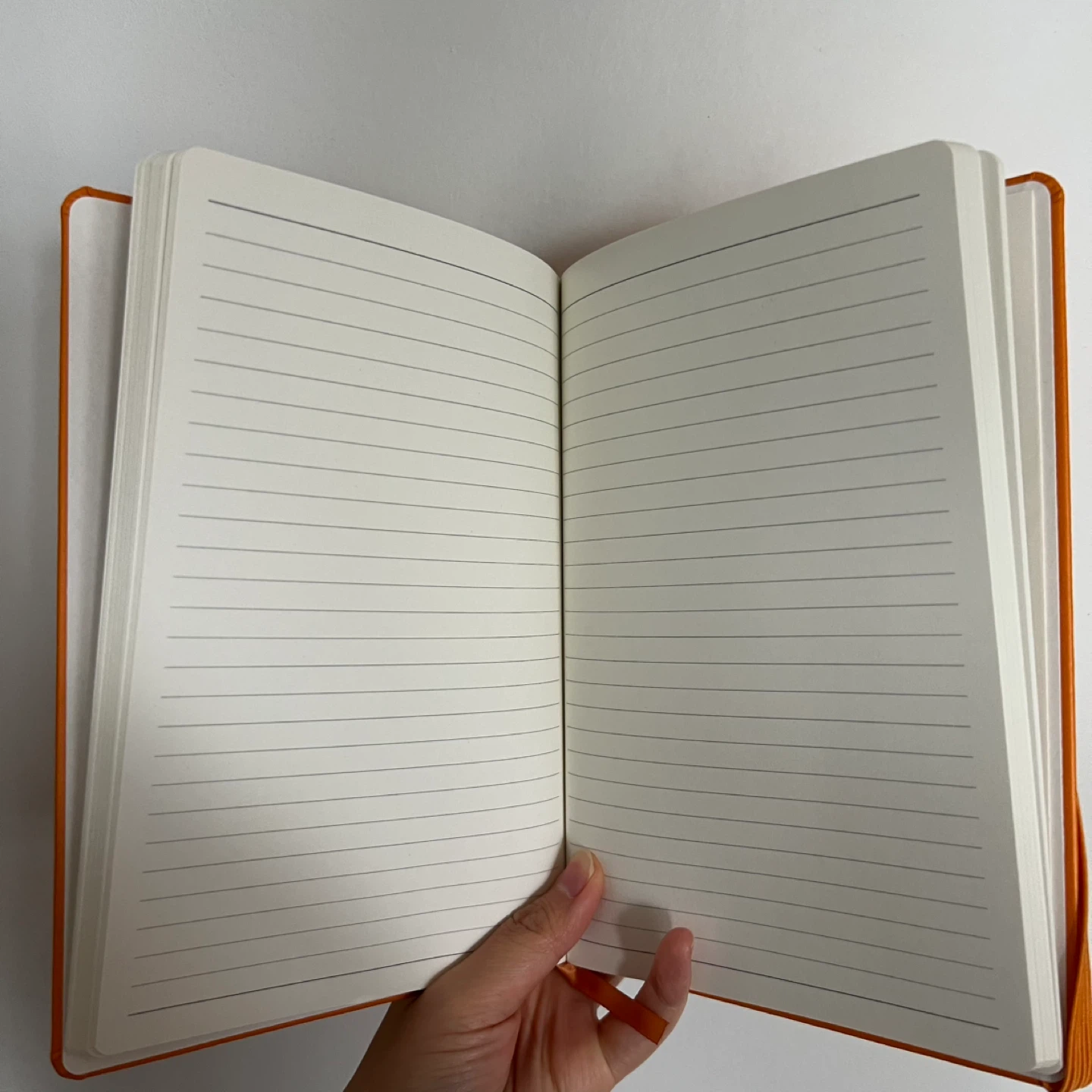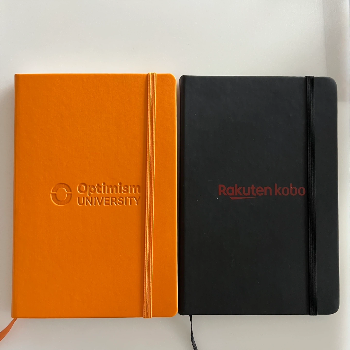 Set of two lined notebooks. One black notebook with Rakuten Kobo branding. One orange notebook with Optimism University branding. Both have elastic closures and ribbon bookmarks.
