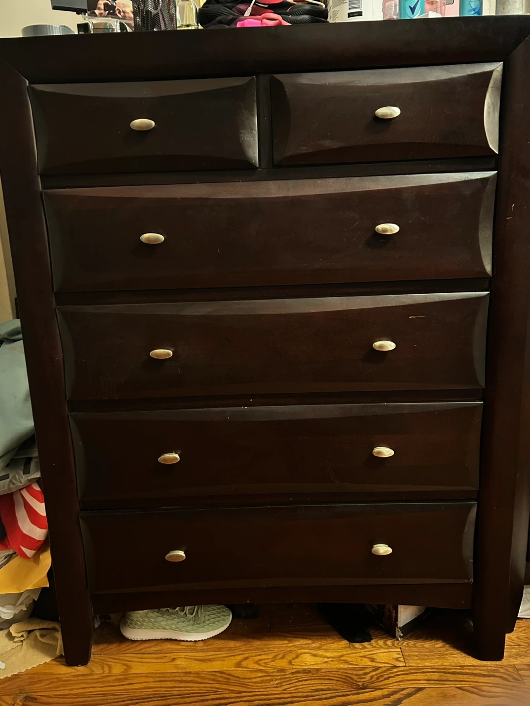 Dark brown dresser with six drawers. Features a rich, deep finish and sleek, modern hardware. Wood construction.