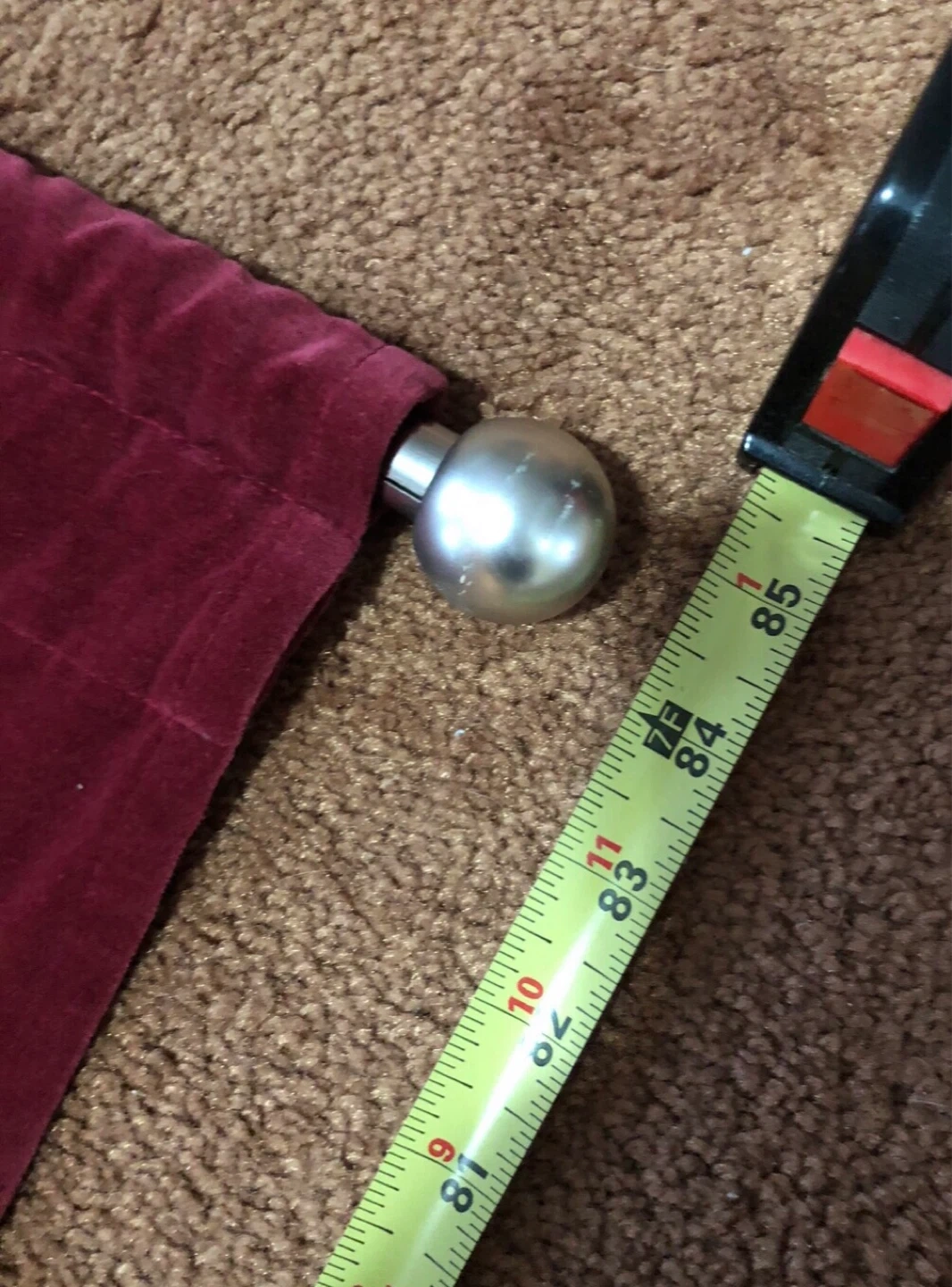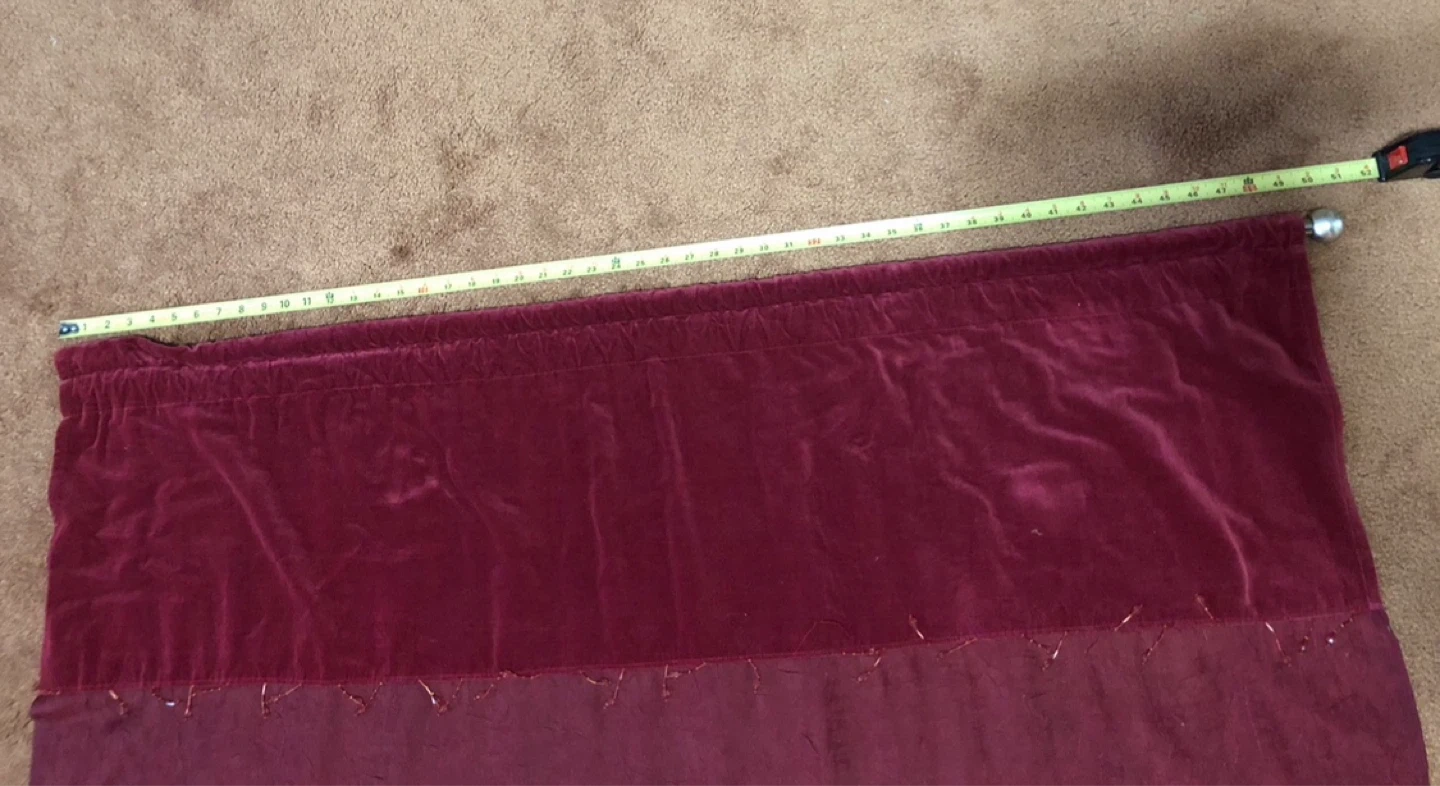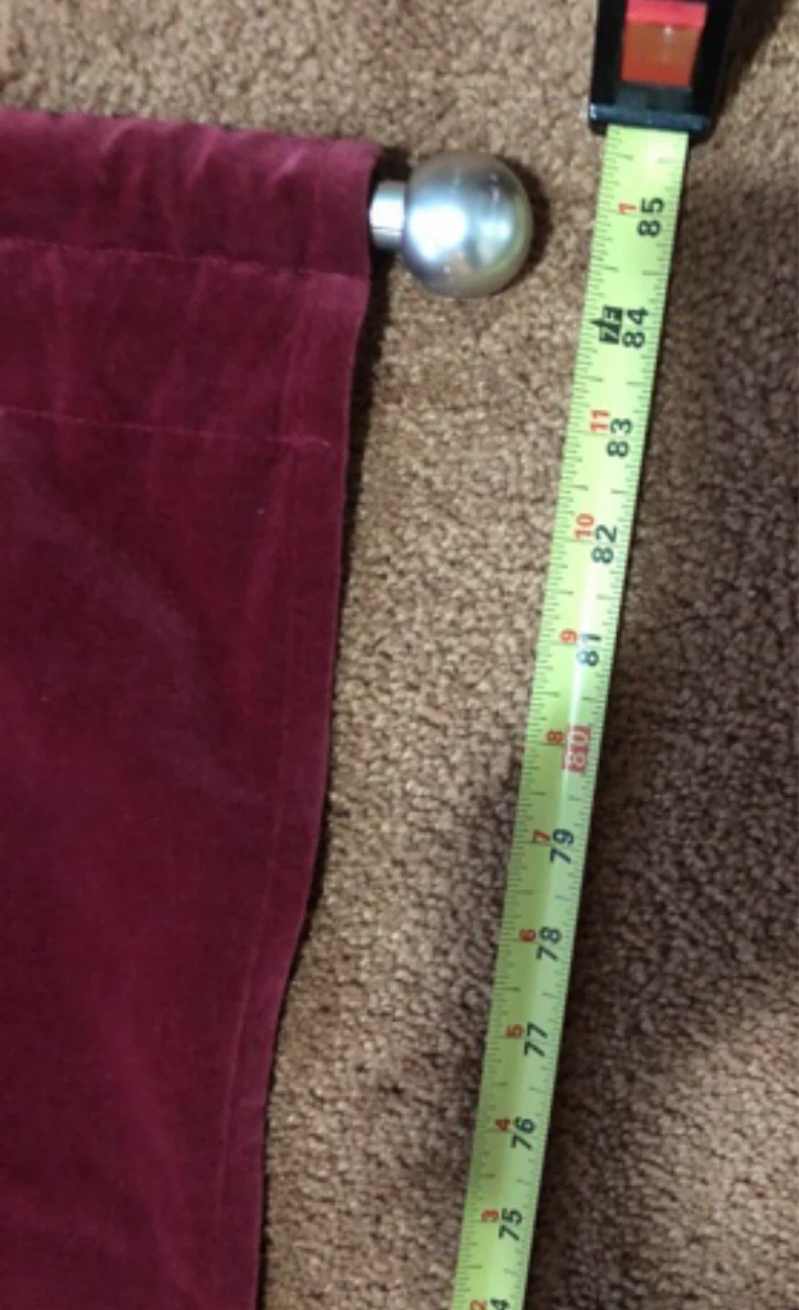 Set of two red velvet and sheer panel curtains. Top features velvet band and bottoms has beaded trim. Each panel measures approximately 85 inches long. Includes decorative finials.