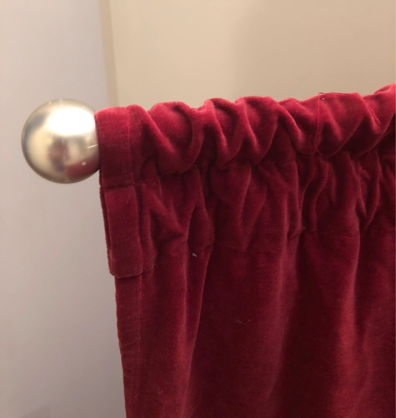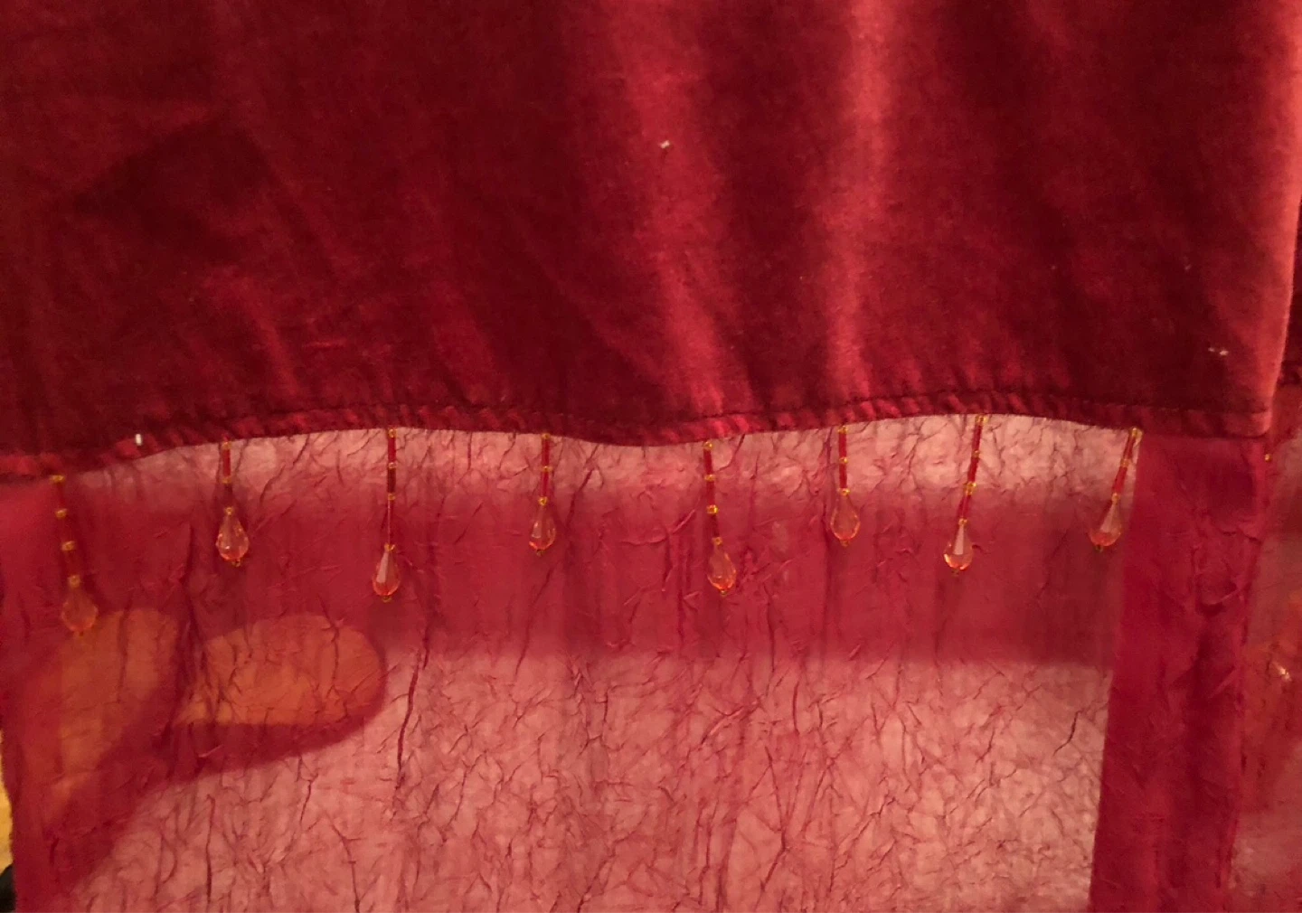Set of two red velvet and sheer panel curtains. Top features velvet band and bottoms has beaded trim. Each panel measures approximately 85 inches long. Includes decorative finials.
