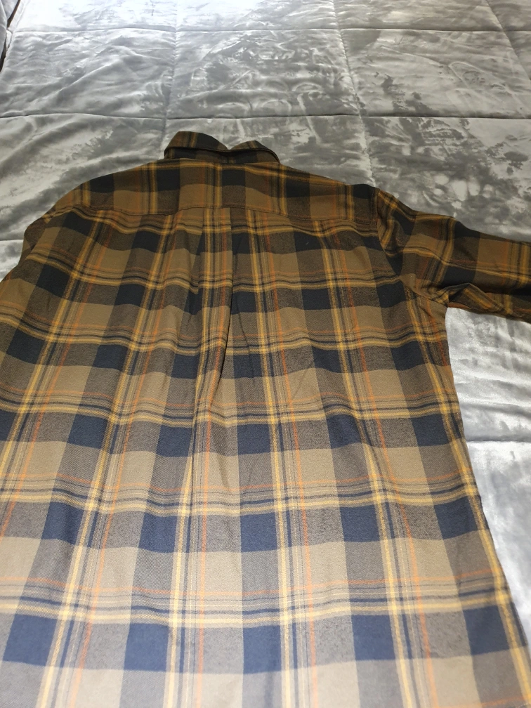 Long sleeve button-down flannel shirt. Brown, black and orange plaid pattern. Two chest pockets. Comfortable fabric. Great for layering.