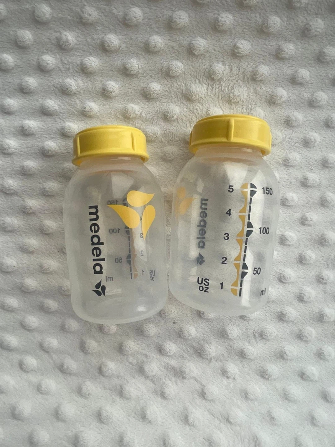 Set of two Medela breast milk bottles. Includes yellow lids for sealing. Each bottle is 5 oz or 150 ml capacity. Measurement markings in oz and ml are clearly visible.