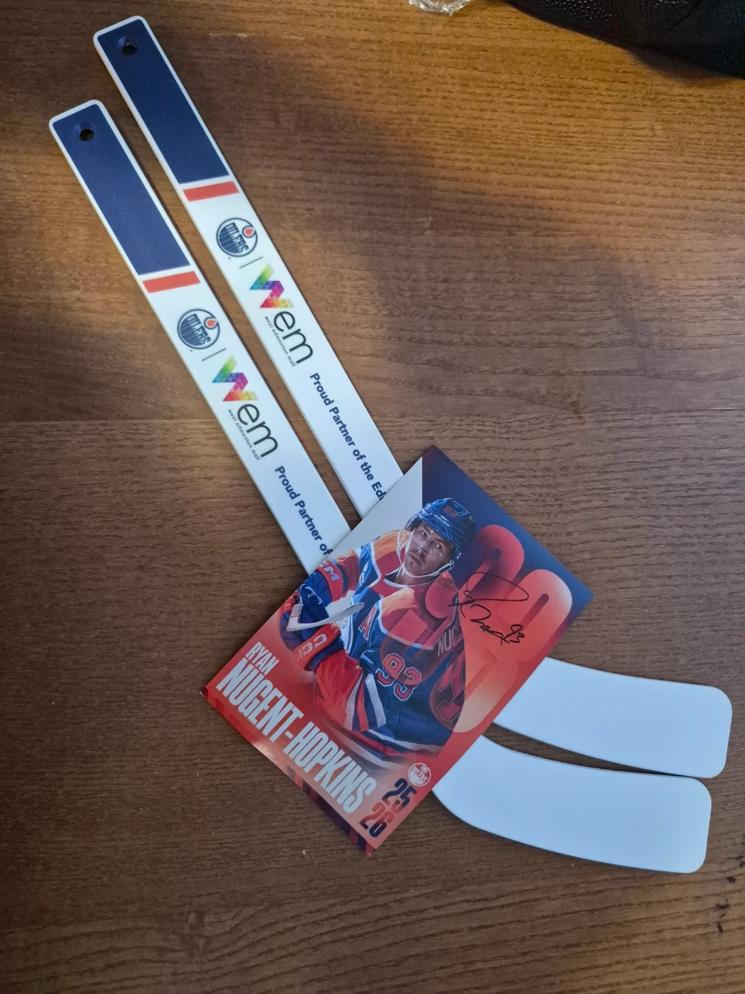 Selling some Oilers and West Edmonton Mall swag! Includes an autographed #93 Ryan Nugent-Hopkins card and two WEM/Oilers branded mini hockey sticks