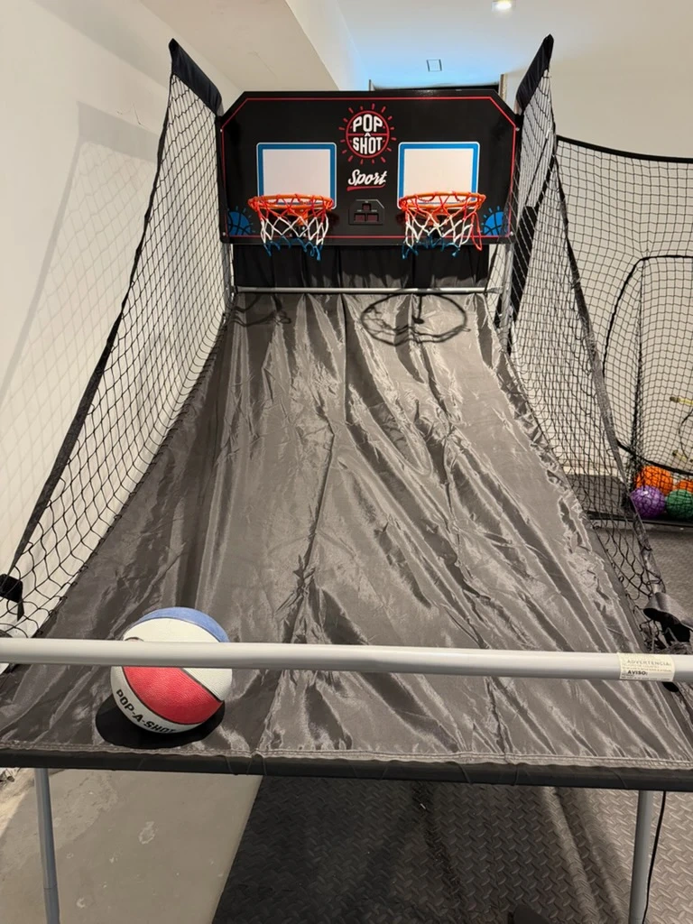 Get ready for some fun with this Pop Shot Sport double hoop basketball game. It's perfect for hours of entertainment indoors or out. Features two hoops and a durable play area. There's 4 balls
